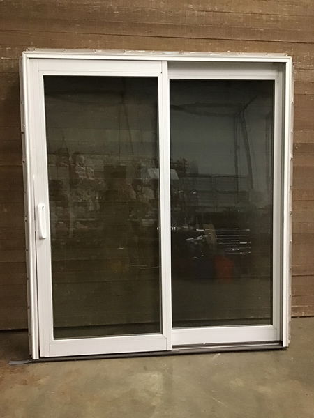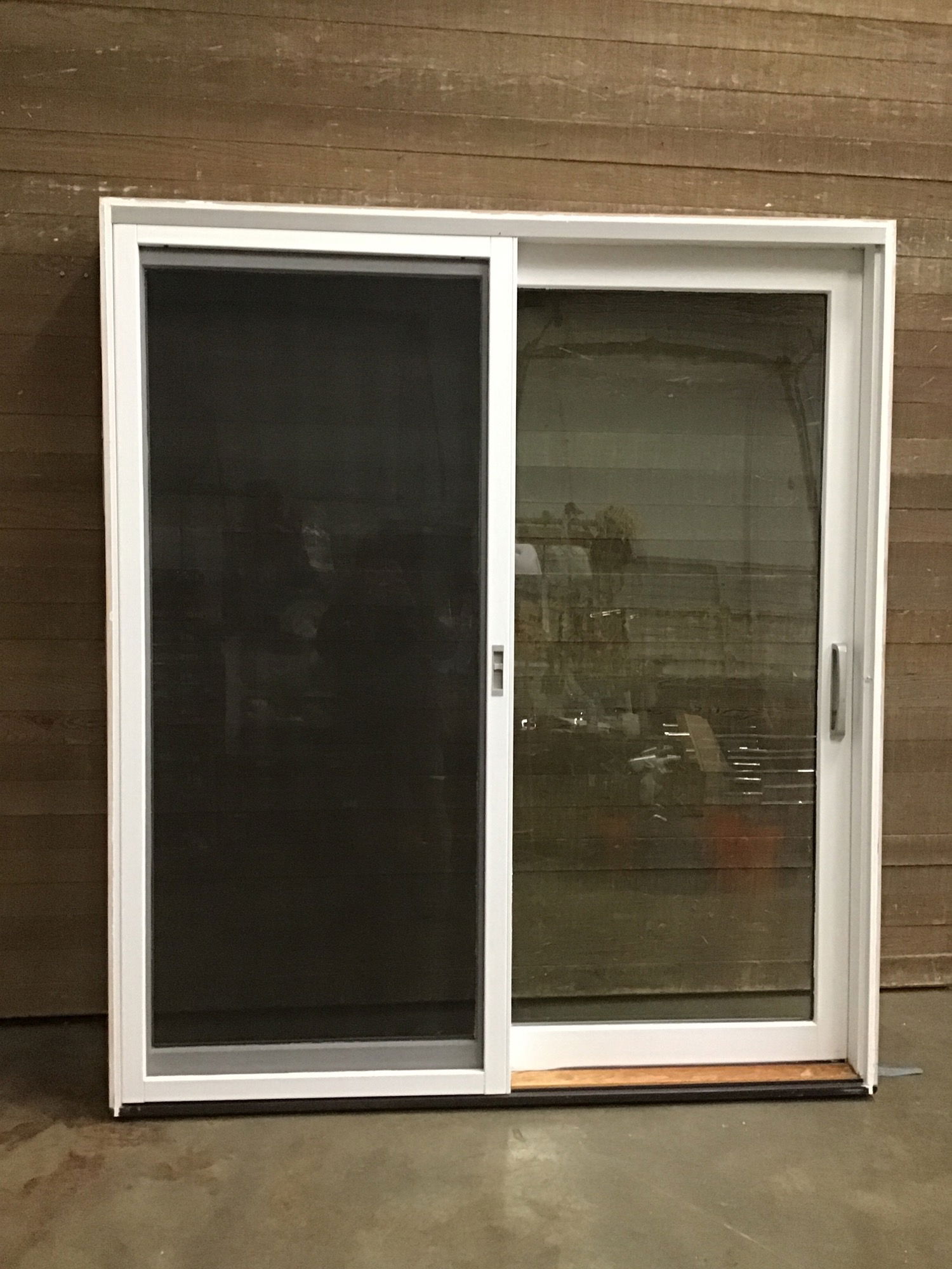 Exterior Pella aluminum clad wood sliding door with one screen and one sliding door. Unsure of age but glass and frame looks great.