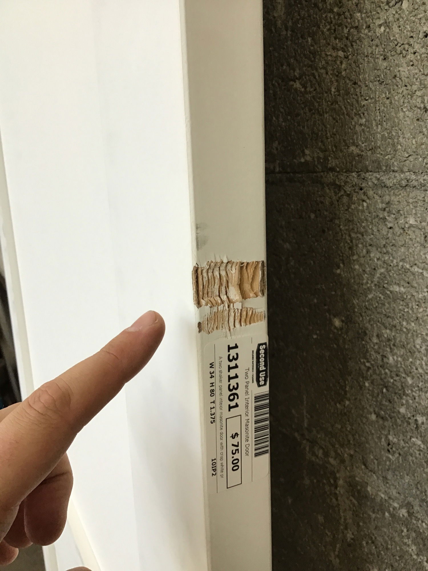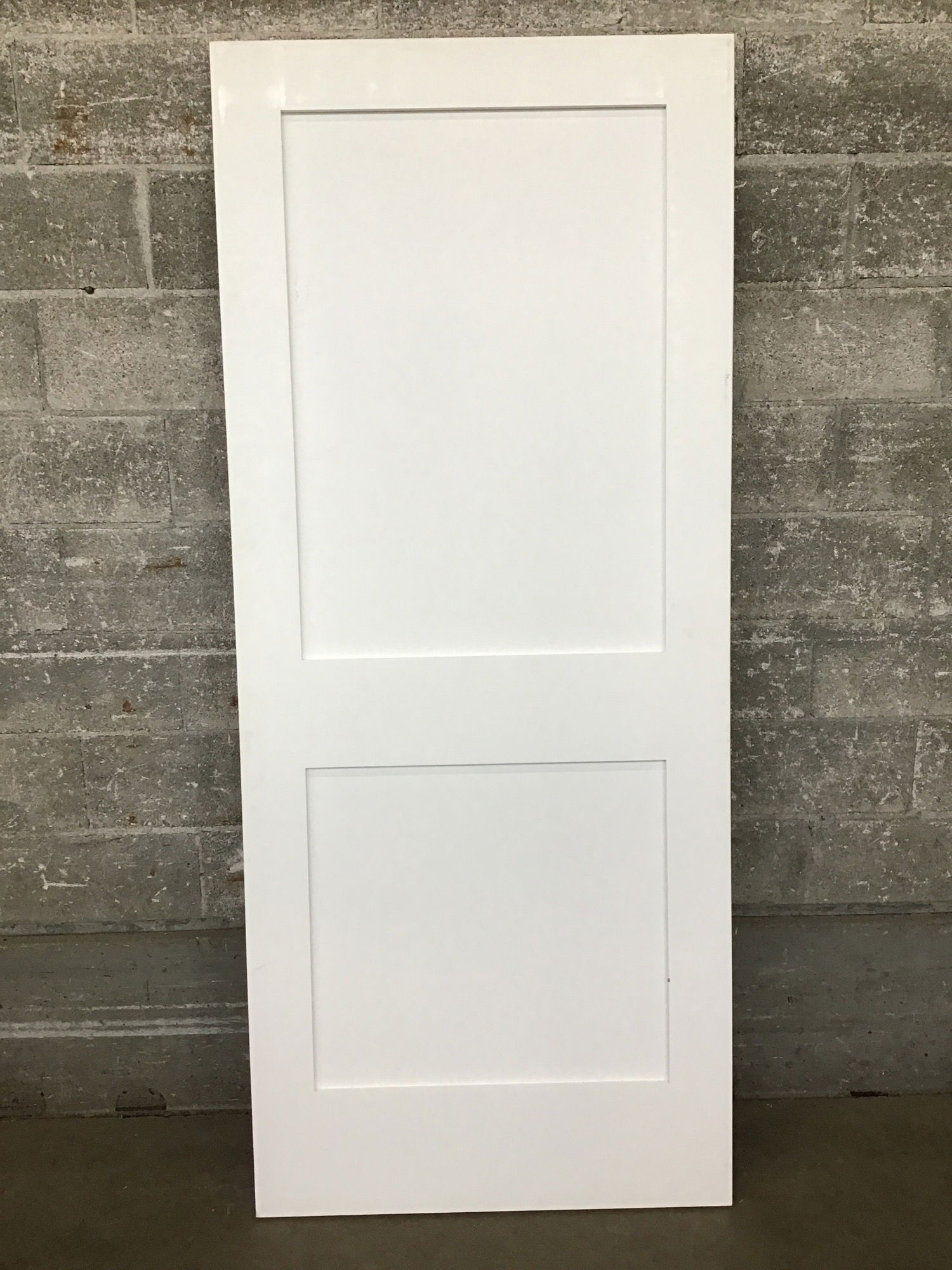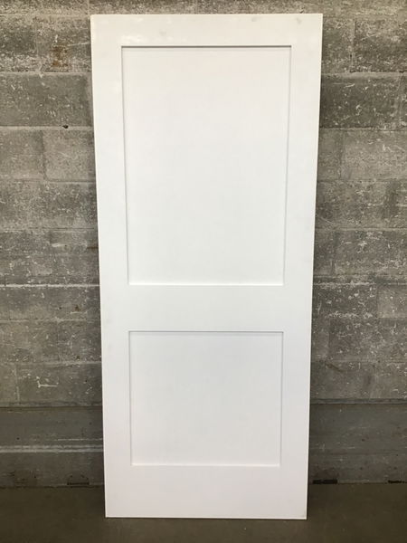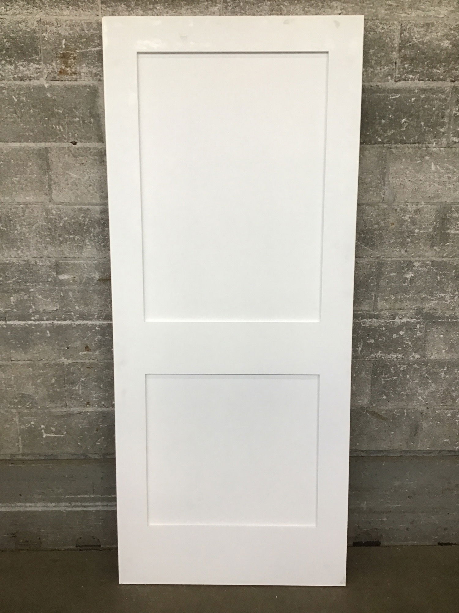 A two shaker panel interior masonite door with crisp white prime. No hinge or hardware cuts, but there is a scrape on one narrow side of door that could be covered easily.