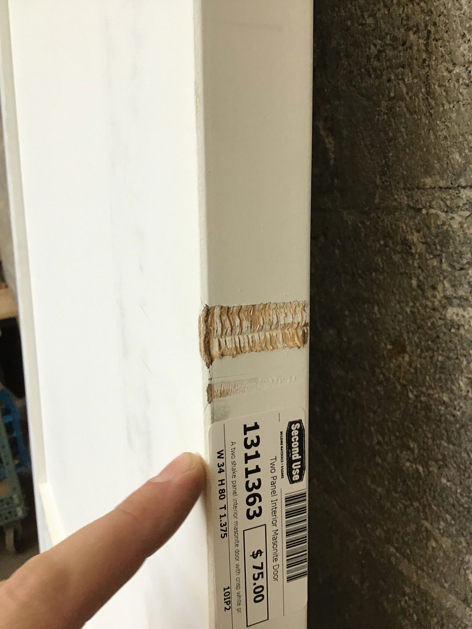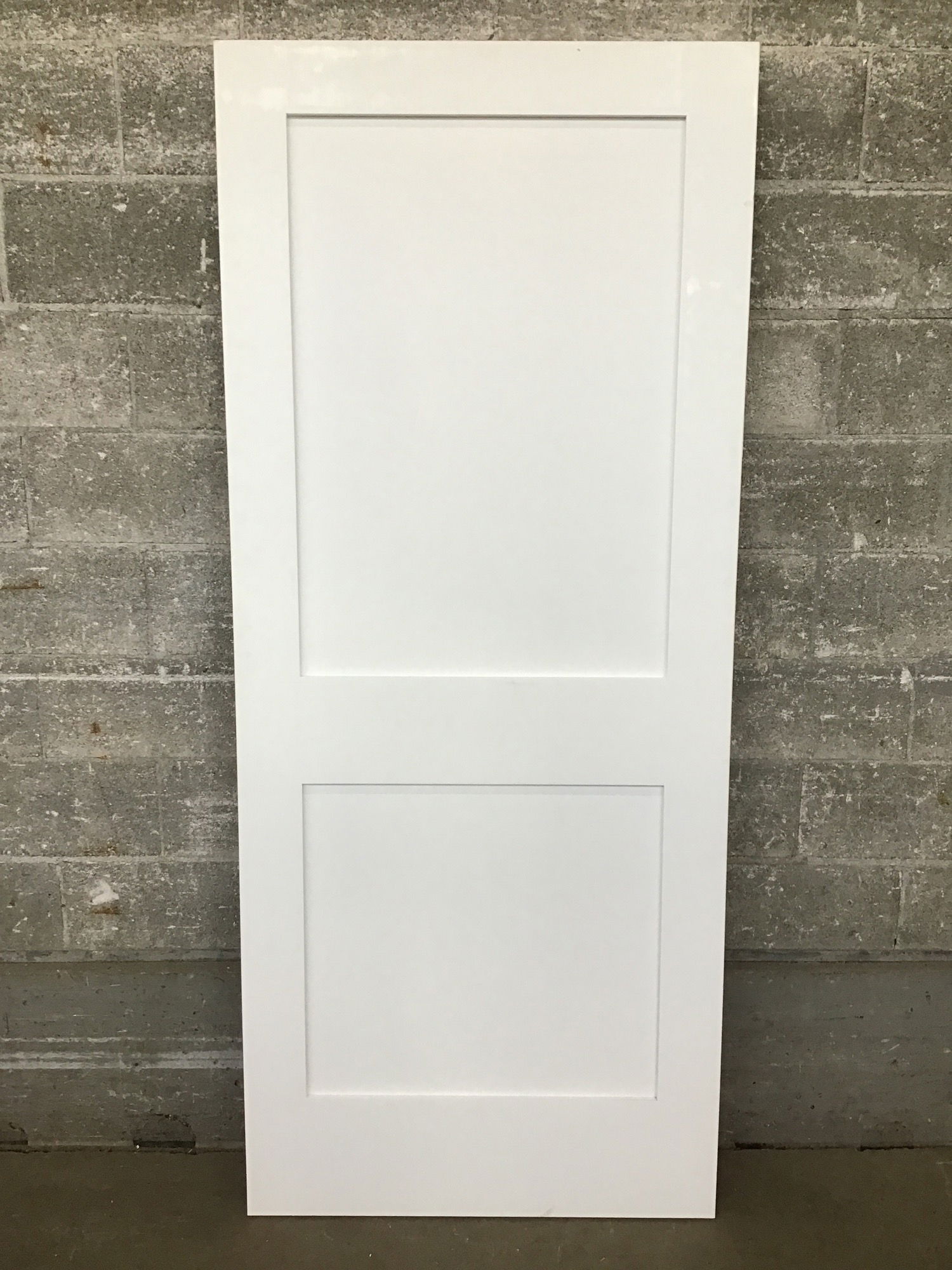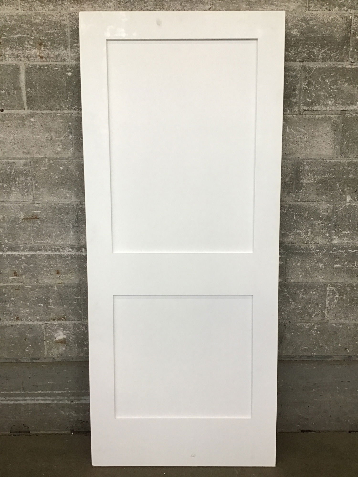 A two shake panel interior masonite door with crisp white prime. No hinge cuts or hardware cuts, but there is a scrape on the narrow side that could be covered easily.