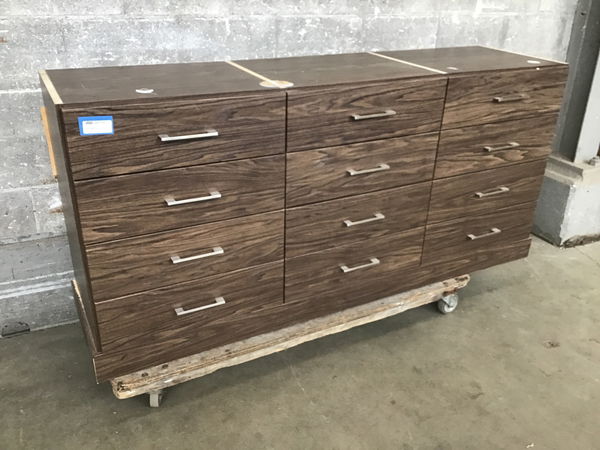 Super functional twelve drawer cabinet that looks like it was made for a large walk in closet. The "dark stained hardwood" face looks like a plastic laminate or photo finish.