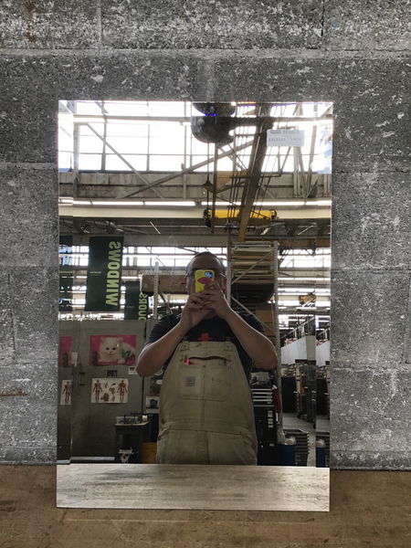 Frameless mirror with beveled glass. Can be mounted in either orientation.