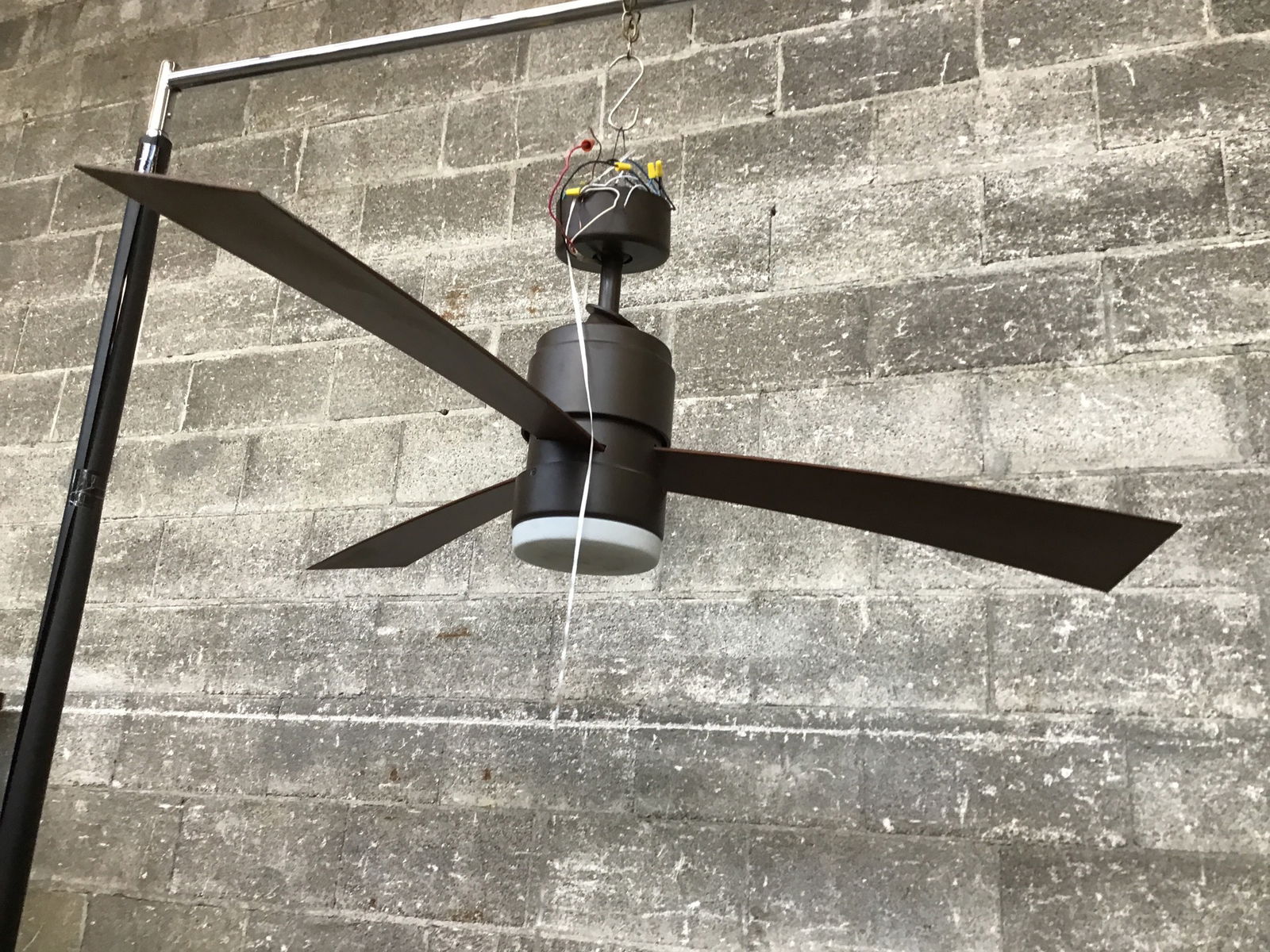 Contemporary 3 blade ceiling fan by Fanimation. Has an integrated light and comes with a remote control.
