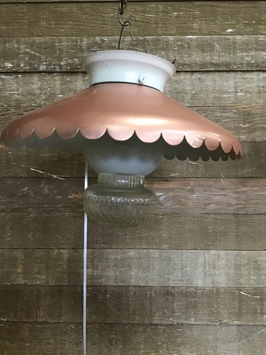 Has a semi-flush mount style fixture but with hanging hurricane chandelier style. Wires are that old cloth style so drop in a new lamp socket before installing!