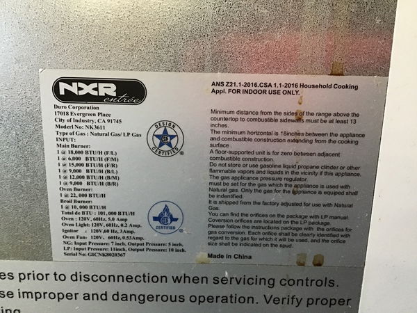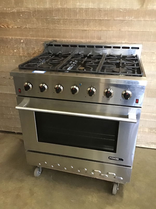2016 NXR Entree professional style gas range with convection oven in good, used condition. Gas powered burners and electric oven. Tested in house and the oven got to temp, and while we can't test the gas function, all the burners clicked as they should. Knobs are available in back upon purchase.