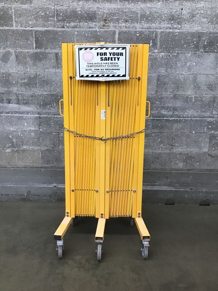 Rolling accordion style expandable fencing section made by Global Industrial. It looks like they call it a "Folding Safety Barricade Gate with Sign", and it sells for $579. Length when "closed" is ~27". Item may have cosmetic damage.  Photo may be representational.