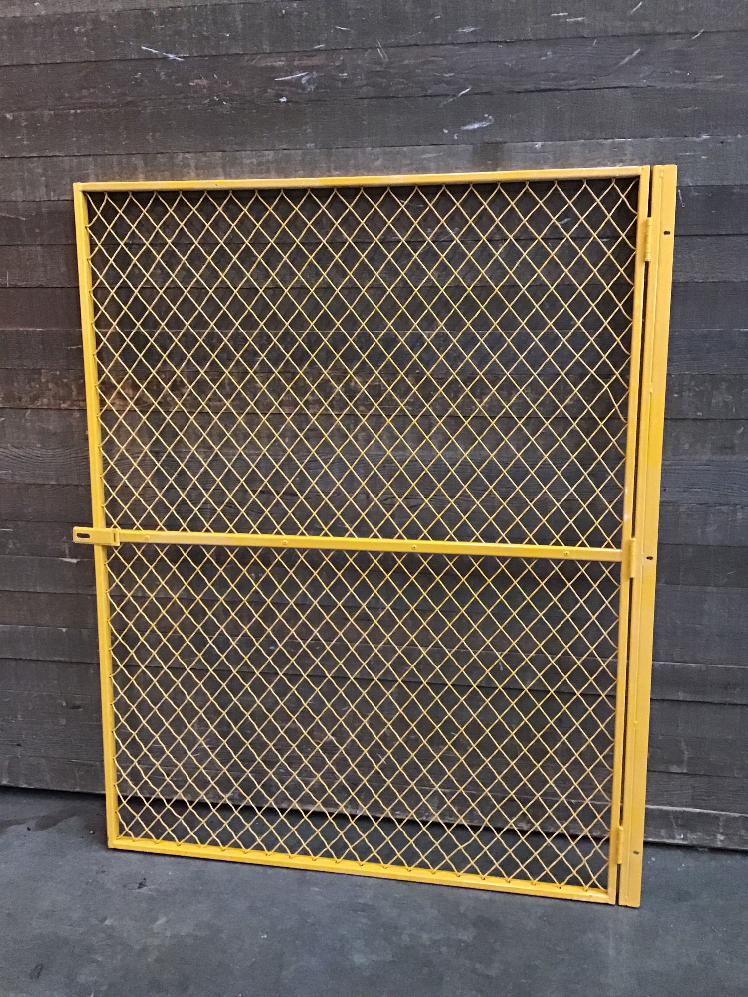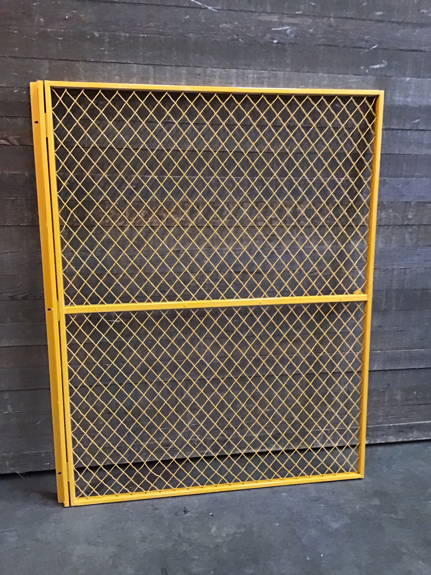5' x 4' yellow steel fencing gate panel, originally for a commercial warehouse Machine Guard. This piece includes a hinged side and a latch side. This is in good, used condition and can be used as a fence piece, trellis, or guard. Photo may be representational.