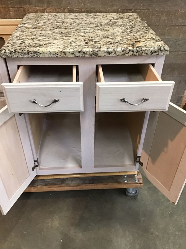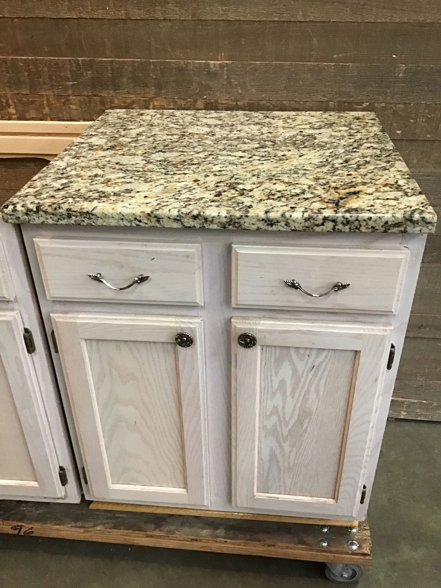 White washed Oak faced kitchen base cab in good, used condition. Comes with a granite countertop. This is a particle board box with two doors and two drawers and one fixed half shelf. Comes with cute hardware with a darker chrome finish. There may be some cosmetic damage on the sides, but other than that it's pretty sound and stable.