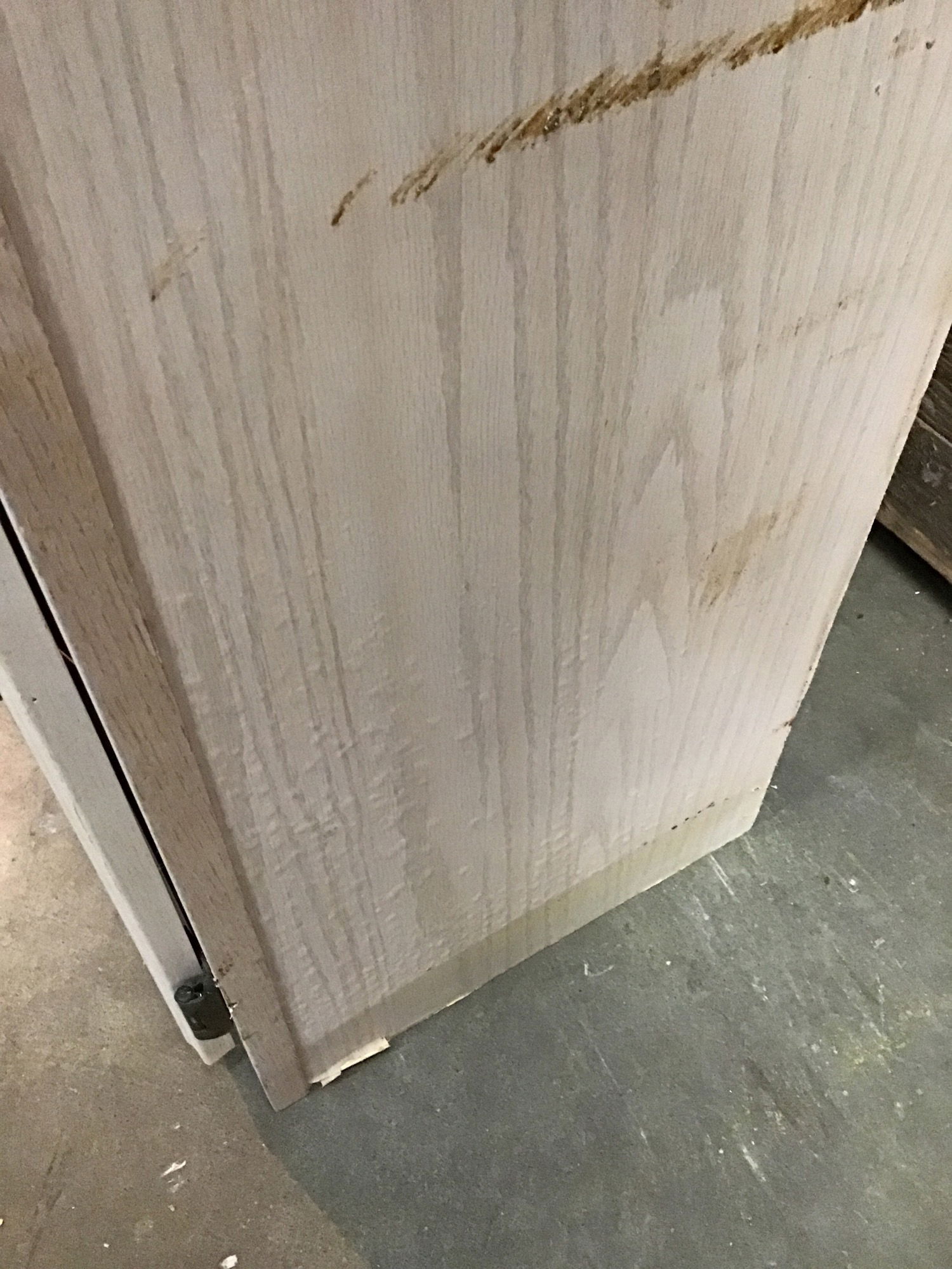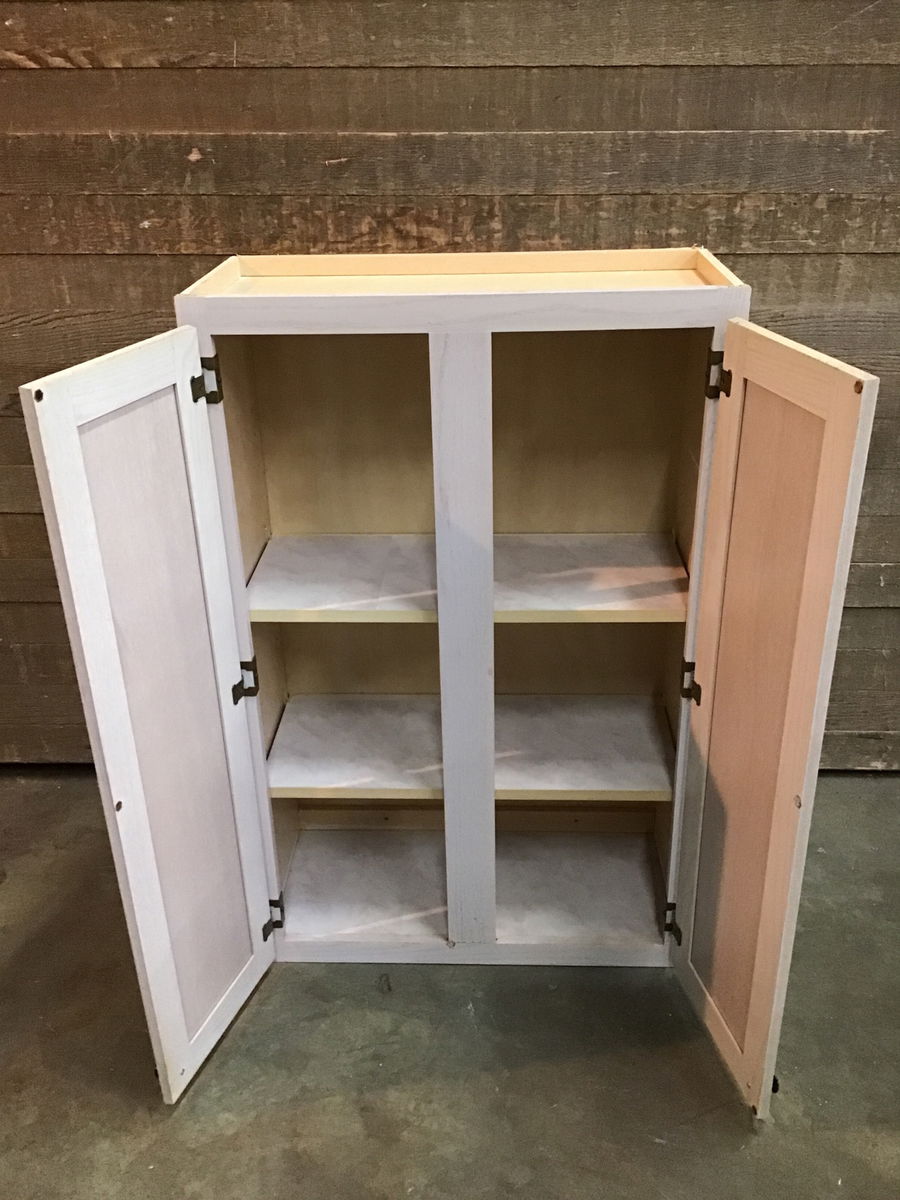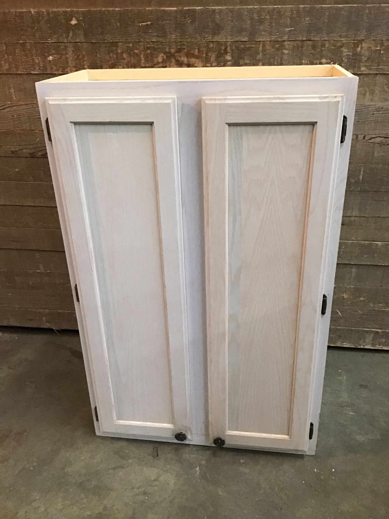 White washed Oak faced kitchen upper cabinet in good, used condition. This is a particle board box with two doors with two adjustable shelves. Comes with cute hardware with a darker chrome finish. There's some water damage on one side, but is otherwise in decent sturdy shape. Price reflects the damage.