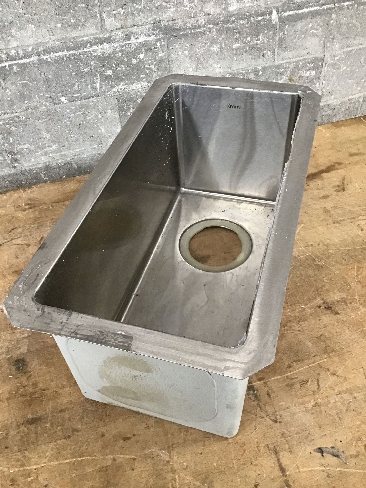 Kraus single basin bar sink/ prep sink, nice and deep, in good shape. Includes drain grate and cover.