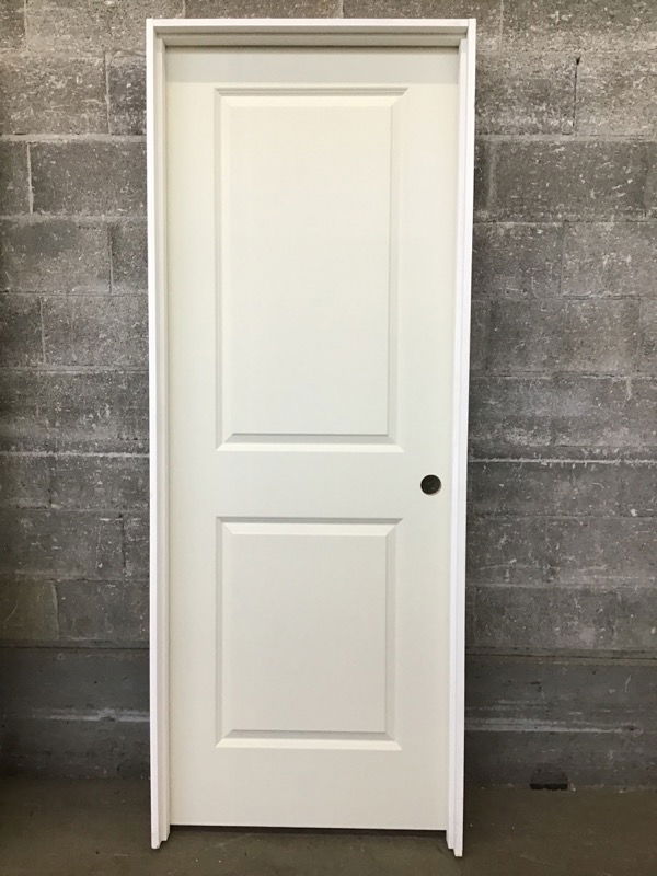 Never installed interior hollow core door with two faux panels and a single hole bored for knobset, in jamb for 2x4 wall. Item may have cosmetic damage. These doors are now up to $179 at HD.