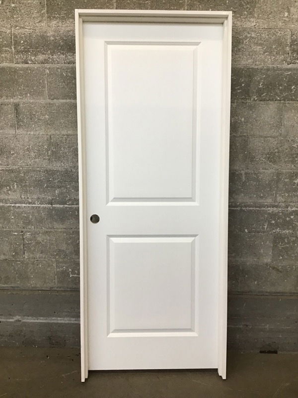 Never installed interior hollow core door with two faux panels and a single hole bored for knobset, in jamb for 2x4 wall. Item may have cosmetic damage. These doors are now up to $179 at HD.
