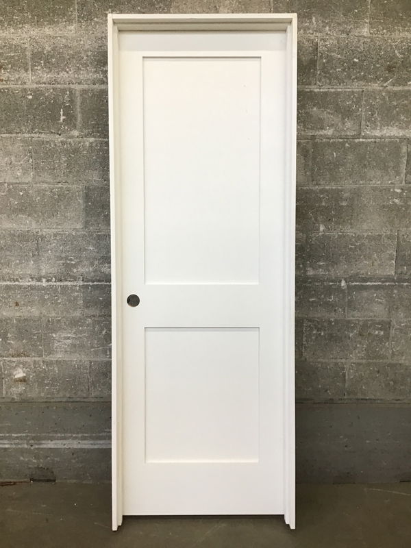 Newer interior door in jamb with two Shaker-style panels, painted white and ready for a 2x4 wall.