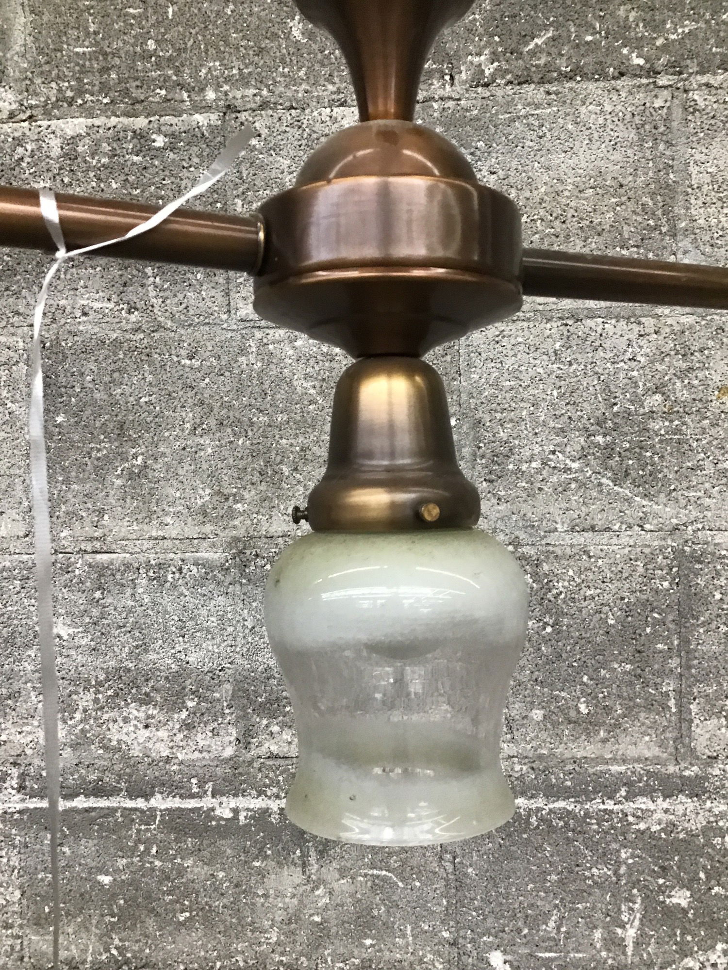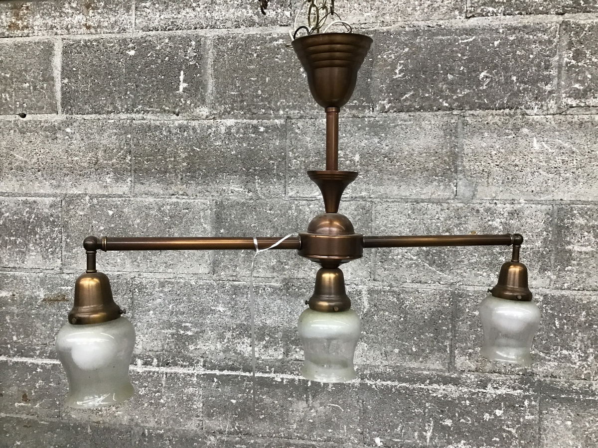 Ca. 2005 Rejuvenation three straight line bulb pendant light with coppery/antique brass looking finish. Shades need a thorough scrub, but otherwise a nice looking 1920's reproduction light that looks ready to go.