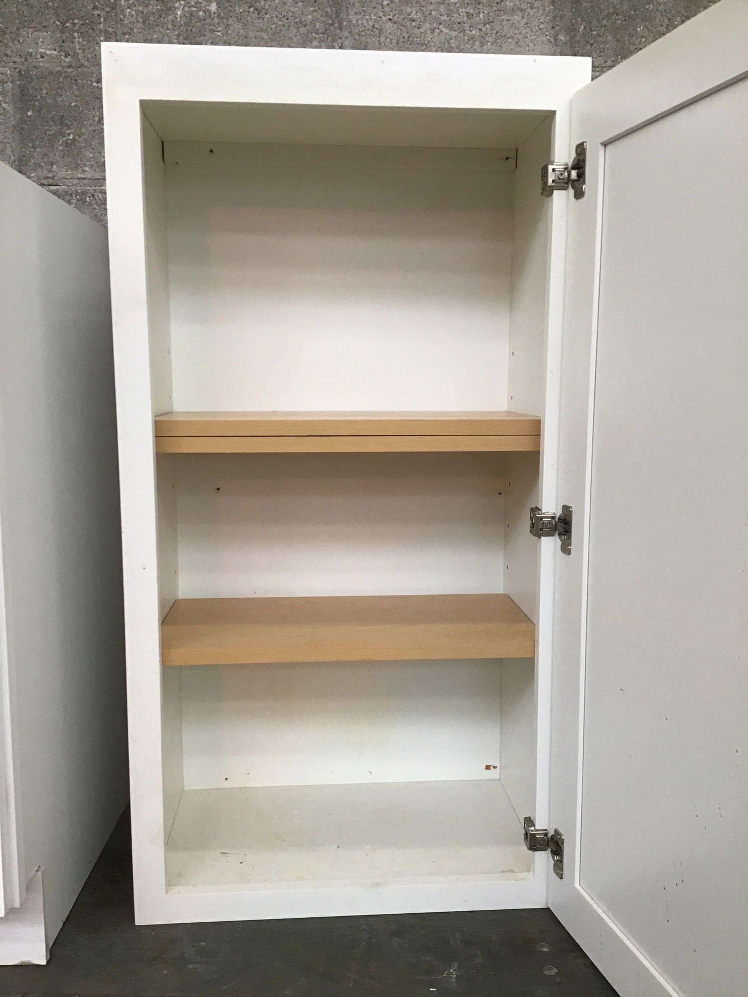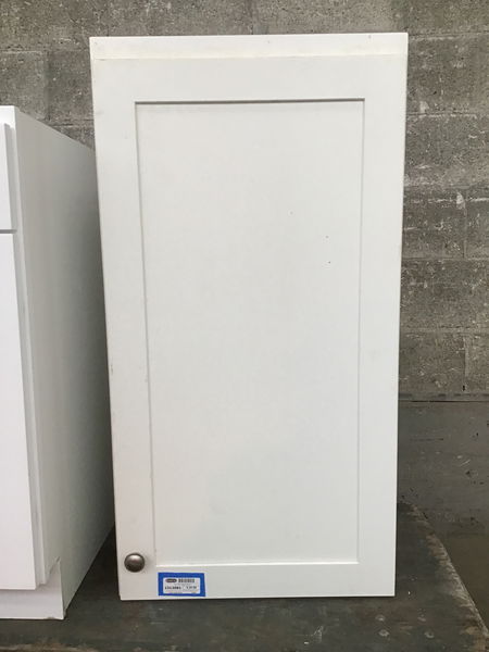 Well-made plywood box upper cabinet with Shaker-style paneled door and a white paint job.