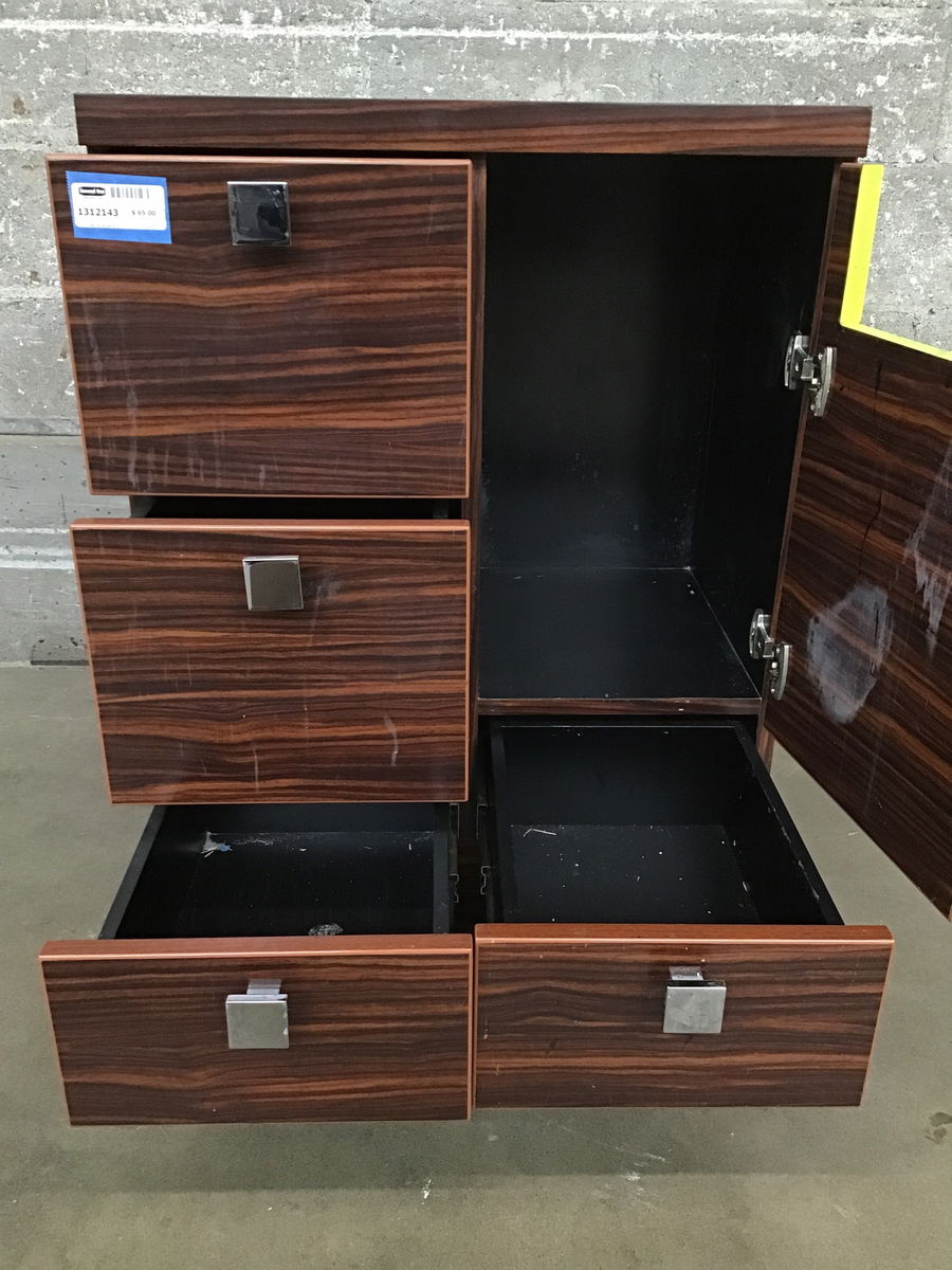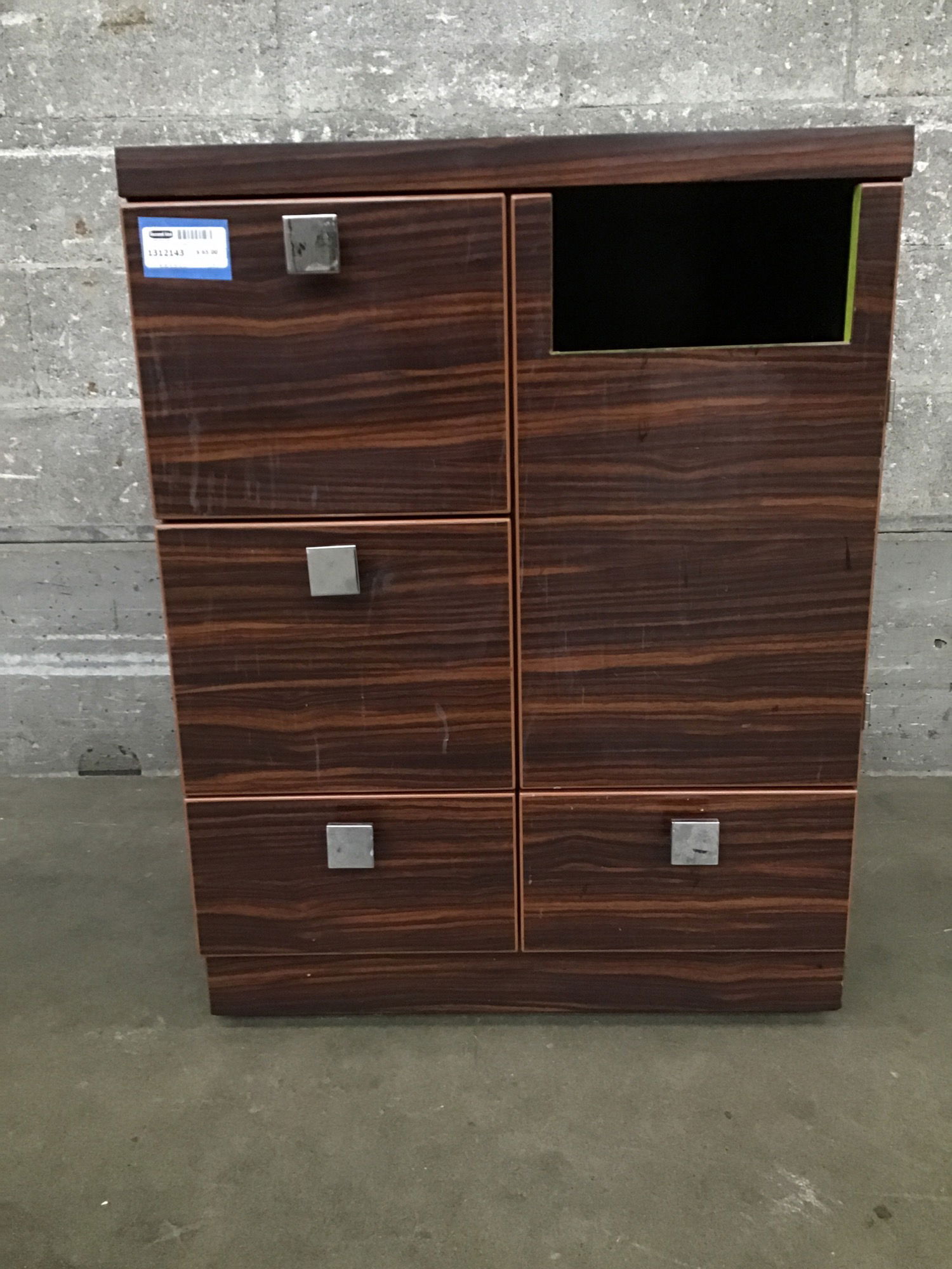 This mod-look, wood grain P-Lam cabinet was formerly used in a salon setting. This one has a countertop and is finished on all sides, and features a cutout in the door that is likely for accessing a trash can.