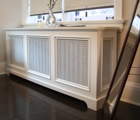 This Fichman Furniture 'Back Bay' radiator cover was custom ordered for its previous owner and has a metal screen. Don't have radiators? Use it as a plant stand! Assembly required but all parts are included. Second photo is an example of what it looks assembled (may be a different size). Dimensions are approximate.