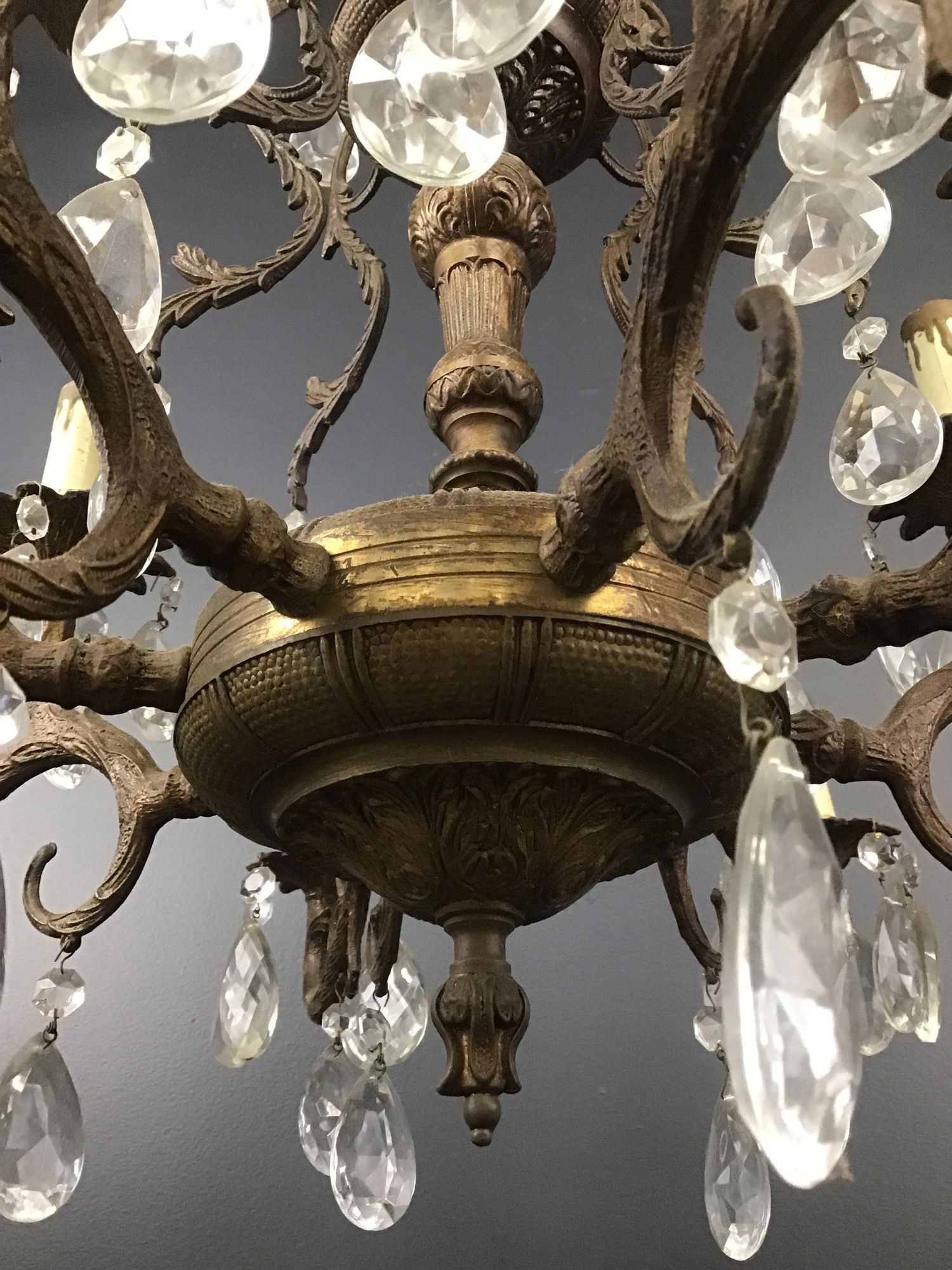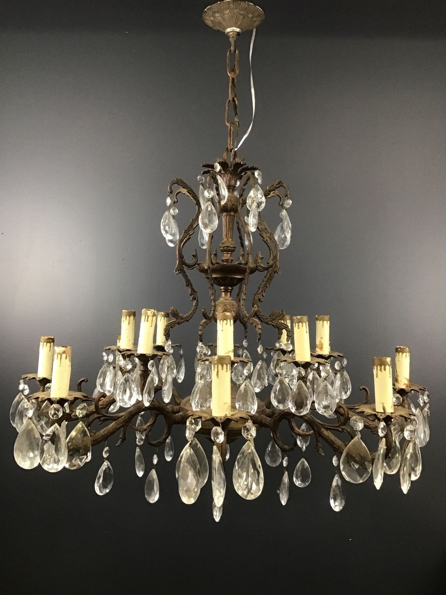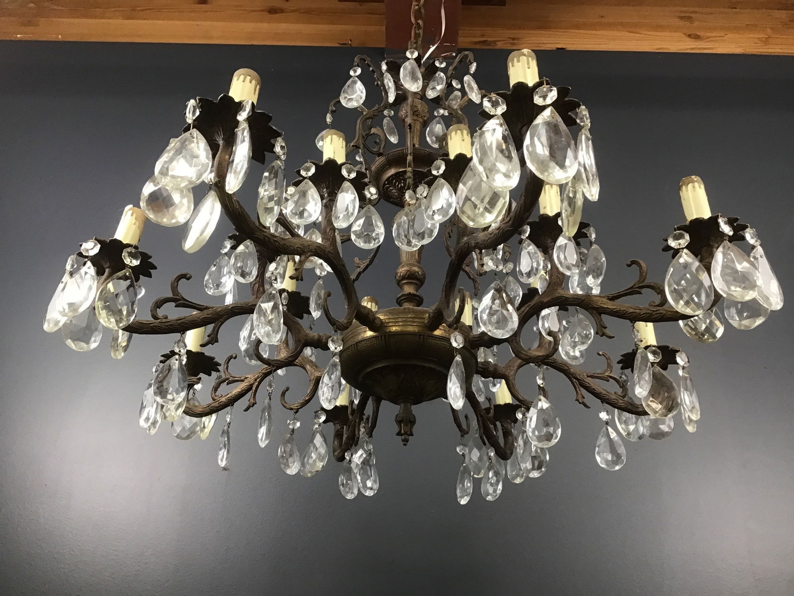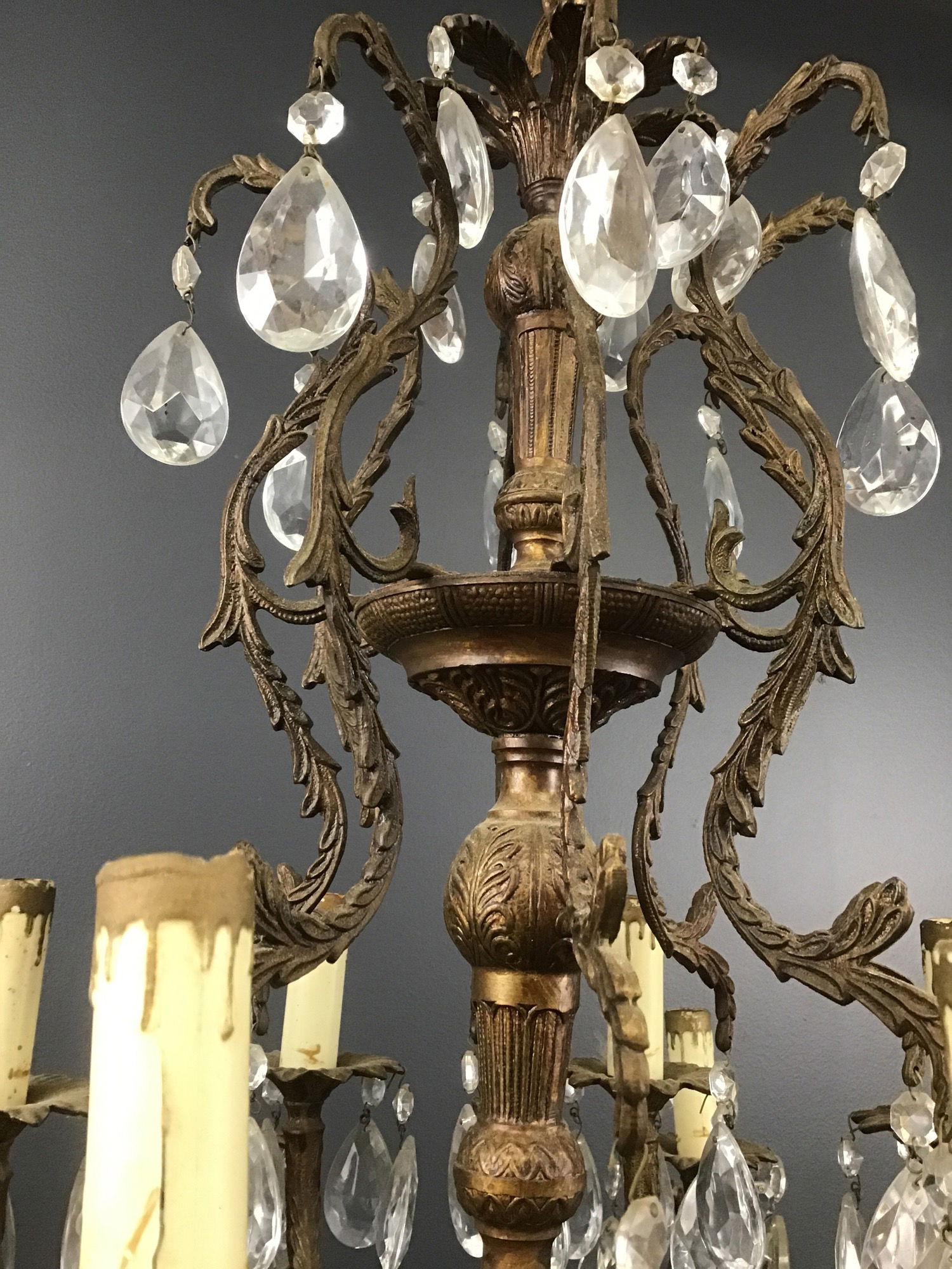 Extravagant solid brass SIXTEEN-arm Spanish Revival chandelier dripping with crystals. Features fabulous candle-style lights and ornate details on every surface, from the rosette to the chain to the finial. Wiring looks great, ready to bring some glamour to your space.