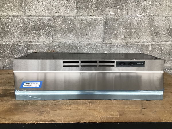 Broan vent hood meant to be installed under an upper cabinet. Looks to have never been installed. 120 V, 60 Hz, 2.0 amps. Fan and light worked when tested in-store.