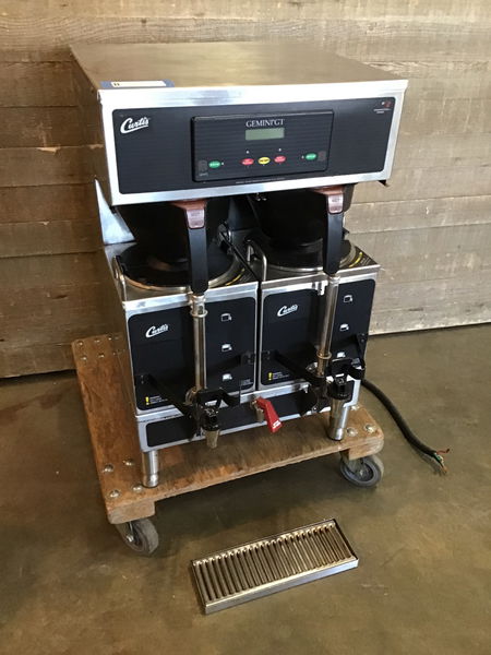 Curtis Gemini GT twin commercial coffee maker in good, used condition. We tested it in house and it powered on fine and appeared completely functional. Comes with a stainless steel drip tray as well. Manufacture date is 2008. This appliance sells new for upwards of $2000, see here for more details. Get this and you'll be ready to serve a whole crew of folks nice hot cups o' joe!