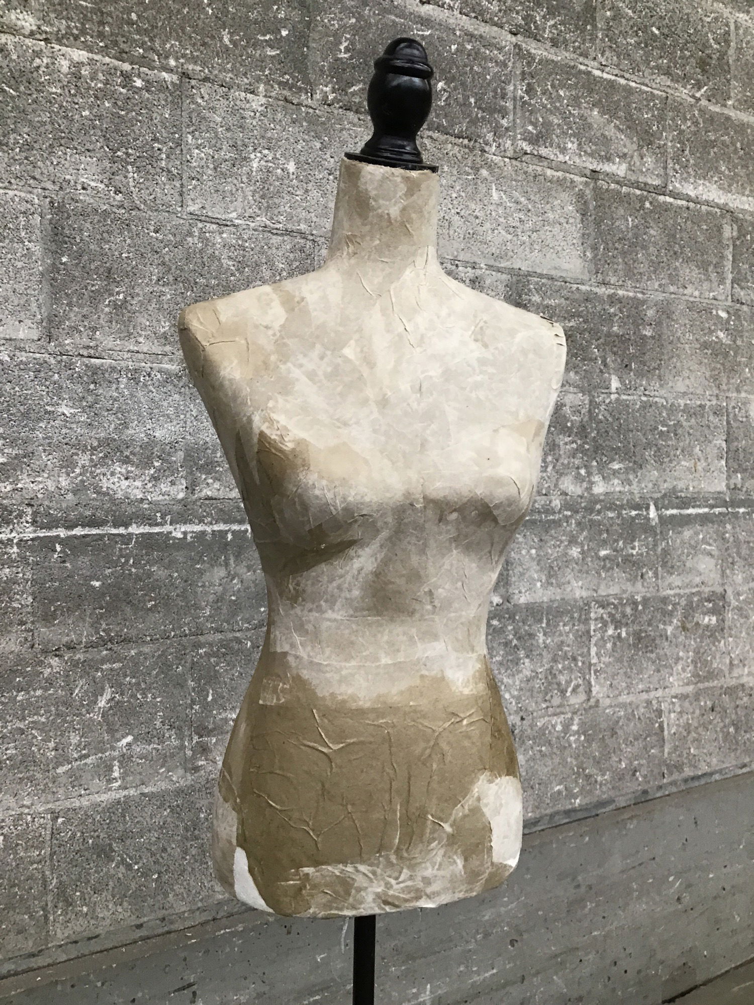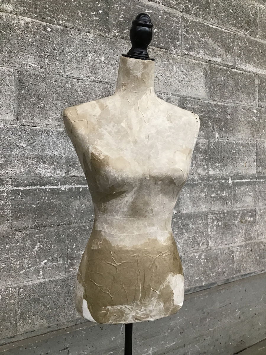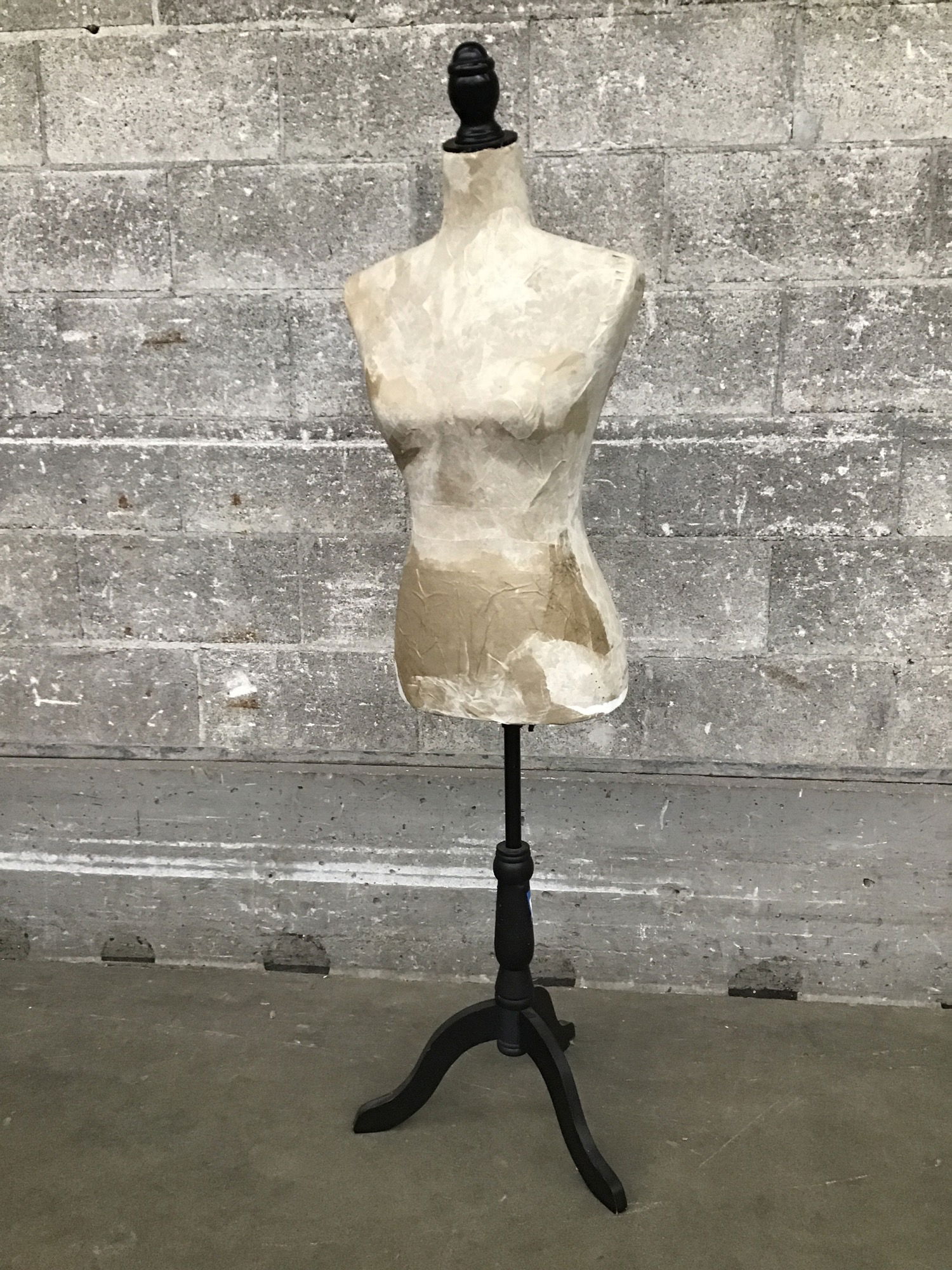 Paper mached mannequin on a wooden stand, ready for your art project or to style your outfits !