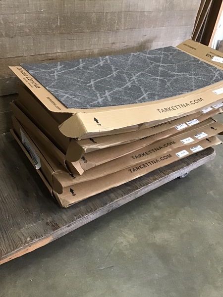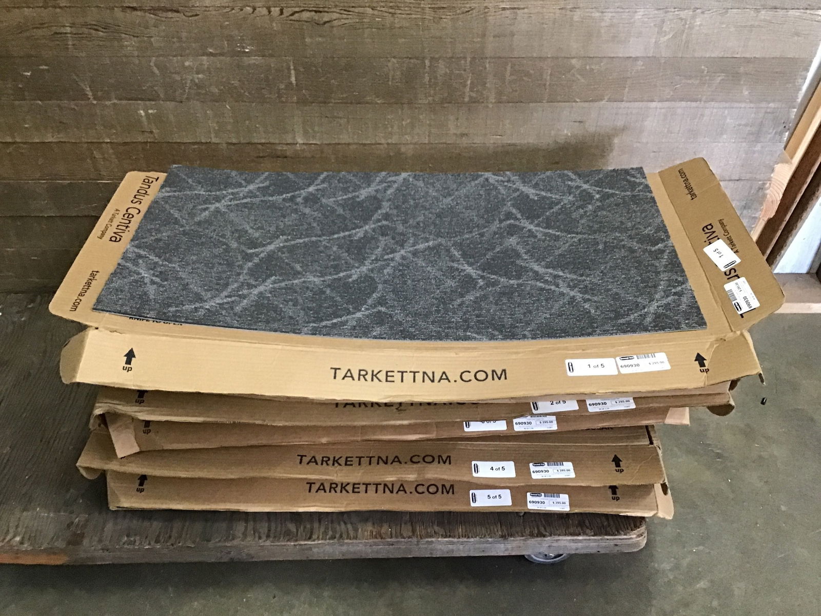 New never installed gray carpet tile with off white "marbled" design. Each tile is 18x36" and comes in boxes of 12 a pop.