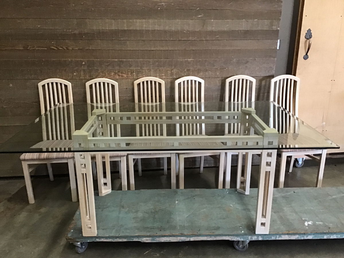 Birch construction dining table set with a unique looking base and sleek chairs, made in Italy and designed by high end furniture designer A. Sibau. Has some wear and small scratching on the glass top.