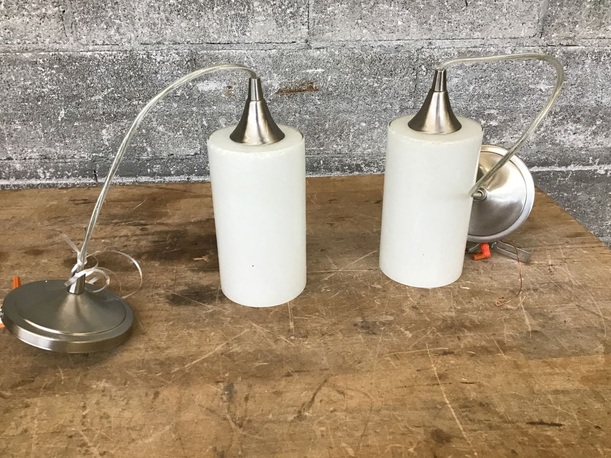 A pair of pendant light fixtures with one bulb each, a brushed nickel finish to their construction, and a milky white diffuser around the bulbs.