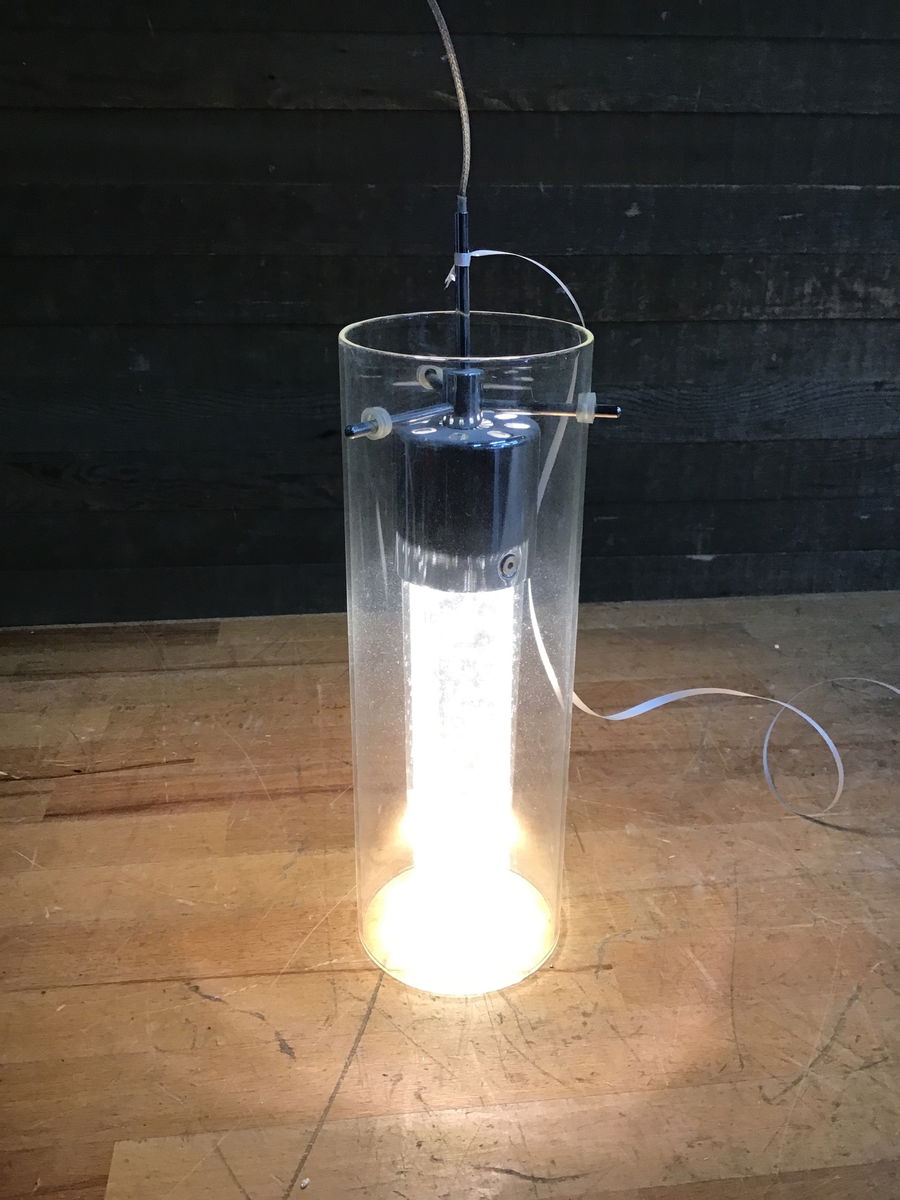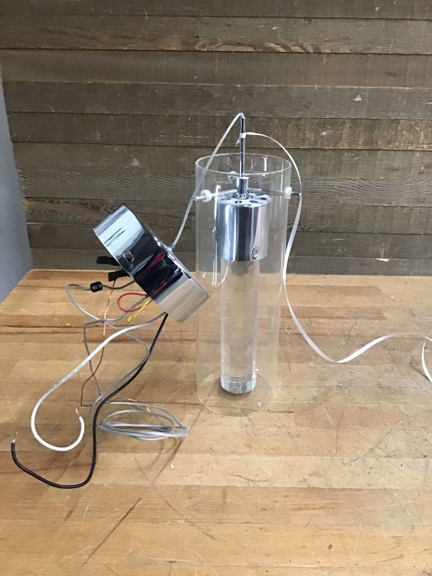Nifty single-bulb LED pendant light fixture with a really cool piece of bubble glass in the shade. Come with sleek chrome finished hardware, and the height of the pendant is adjustable. This one came to us in great condition and retail can be seen here, though you will need a bulb and mounting hardware. Measurement for length is total adjustable length from ceiling, height is length of shade, width is canopy*