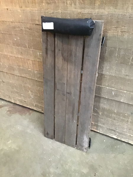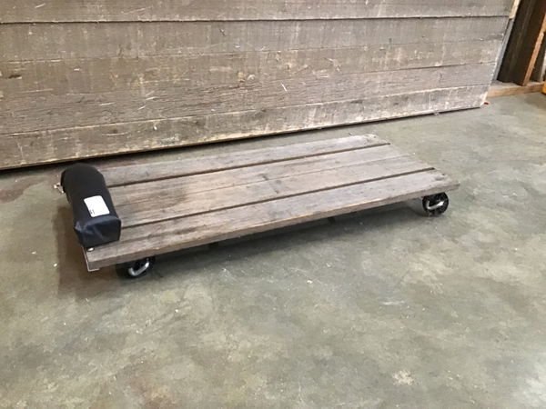 Ol' under the truck creeper with some interesting zig-zaggy looking casters. Cool rustic piece for hanging in your shop.