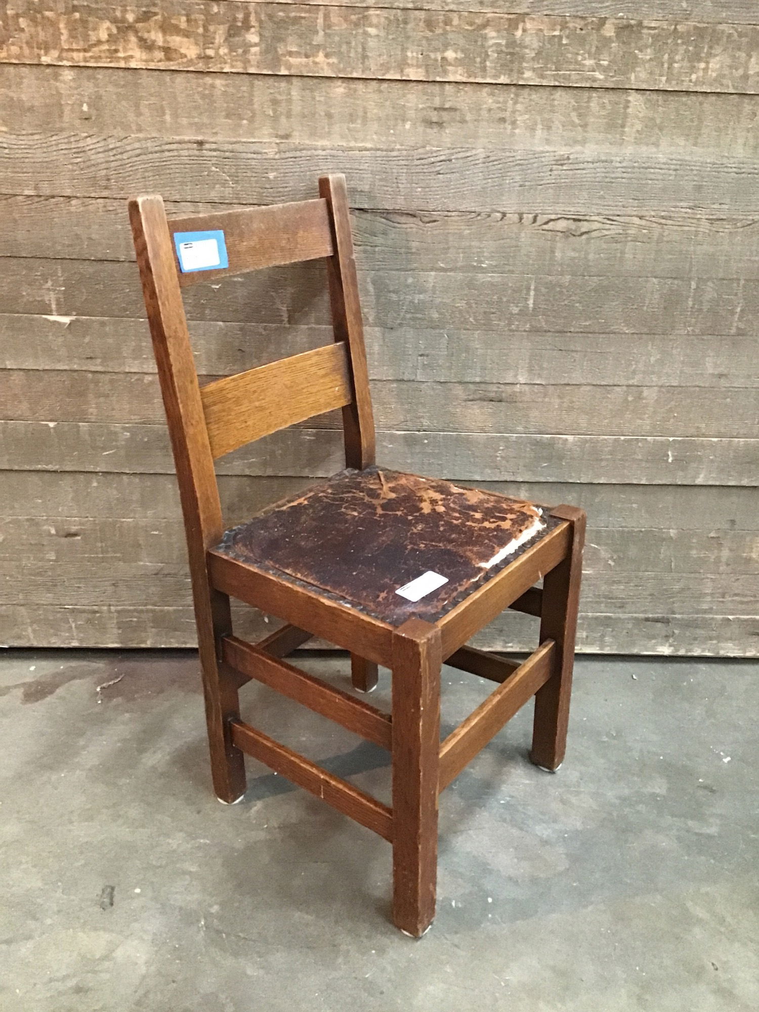Vintage oak dining chair project. Solid oak construction with brass tacked leather cushion that is falling apart.