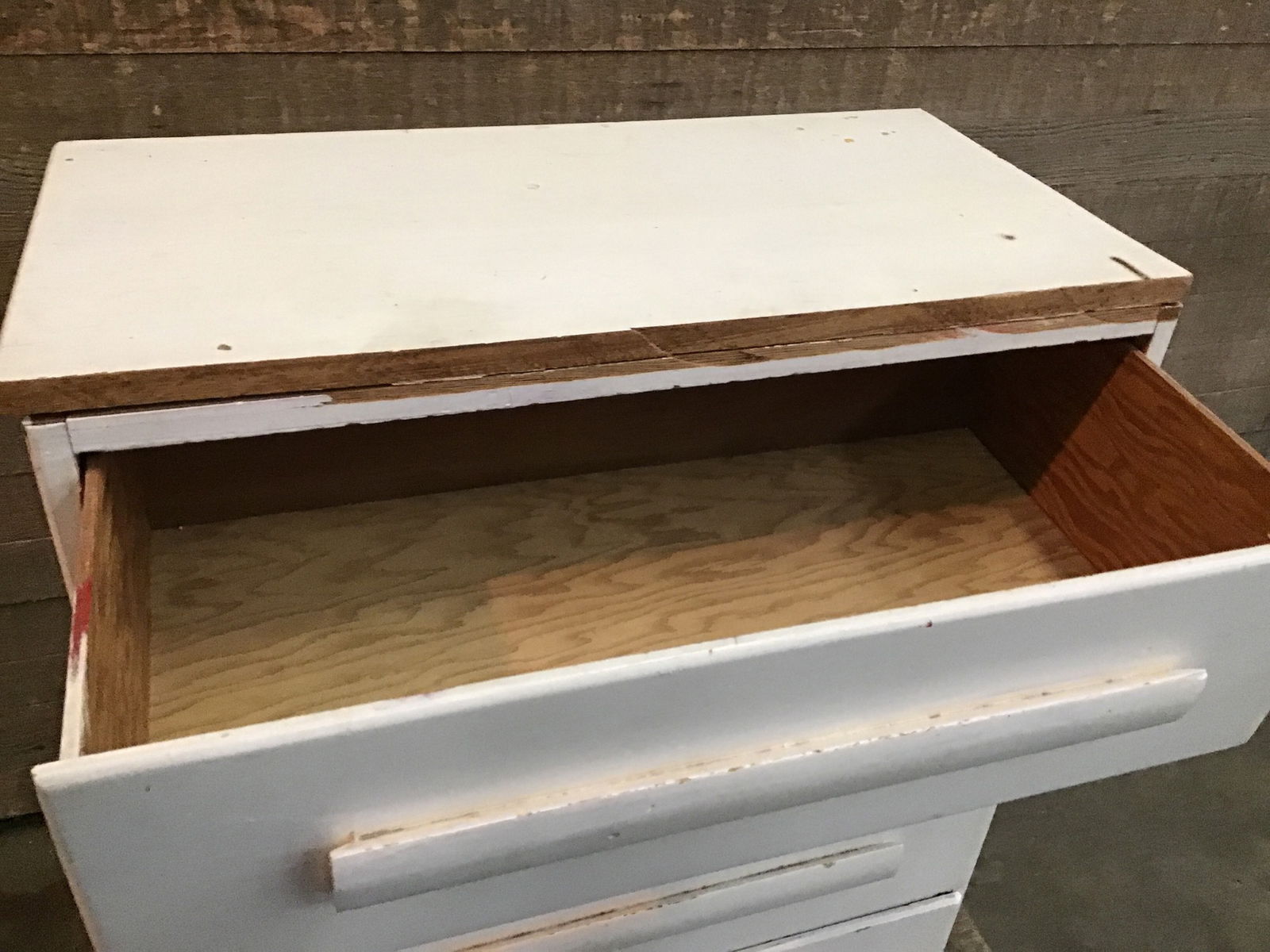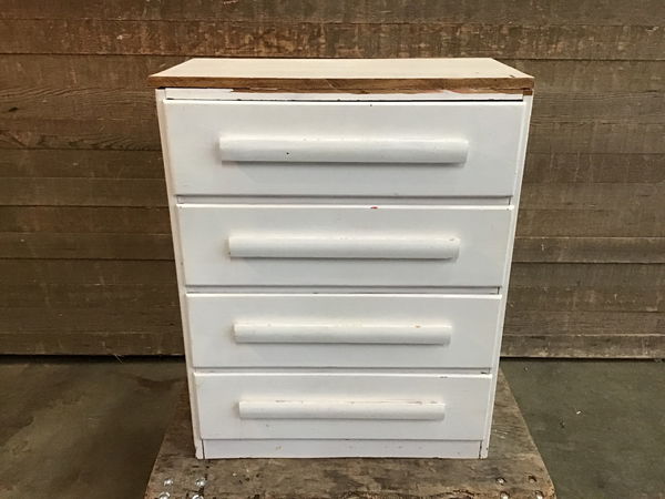 Simple but sturdy wooden dresser painted white all over that has 4 removable drawers with carved-in pulls. Is used for sure and has some stains on top but overall in good condition.