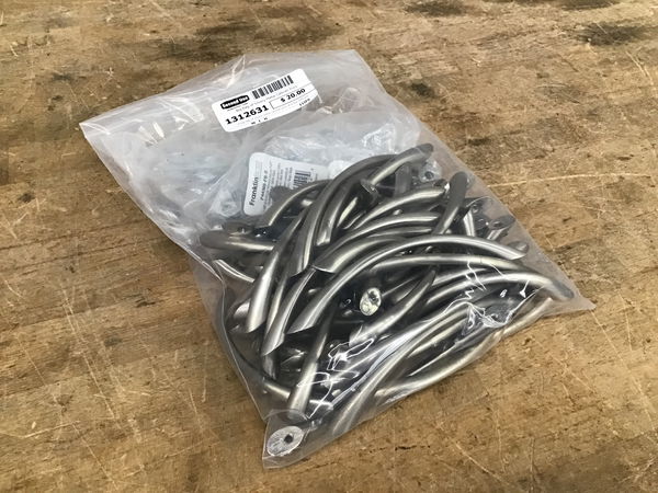 A big bag of silvery metal cabinet pulls of a few different sizes. The bag also includes hardware.