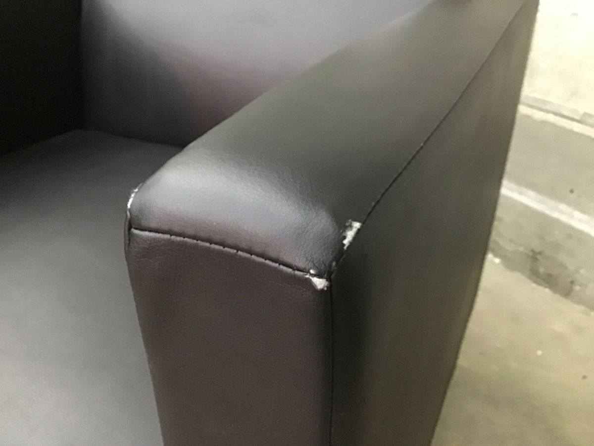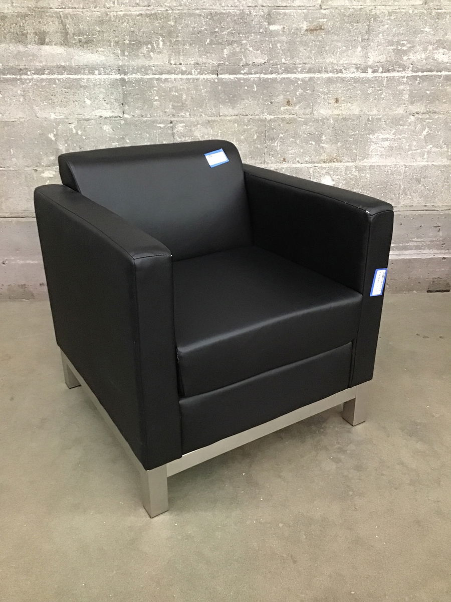Black pleather easy chair that has some wear to original upholstery. Price reflects. Has brushed steel legs.