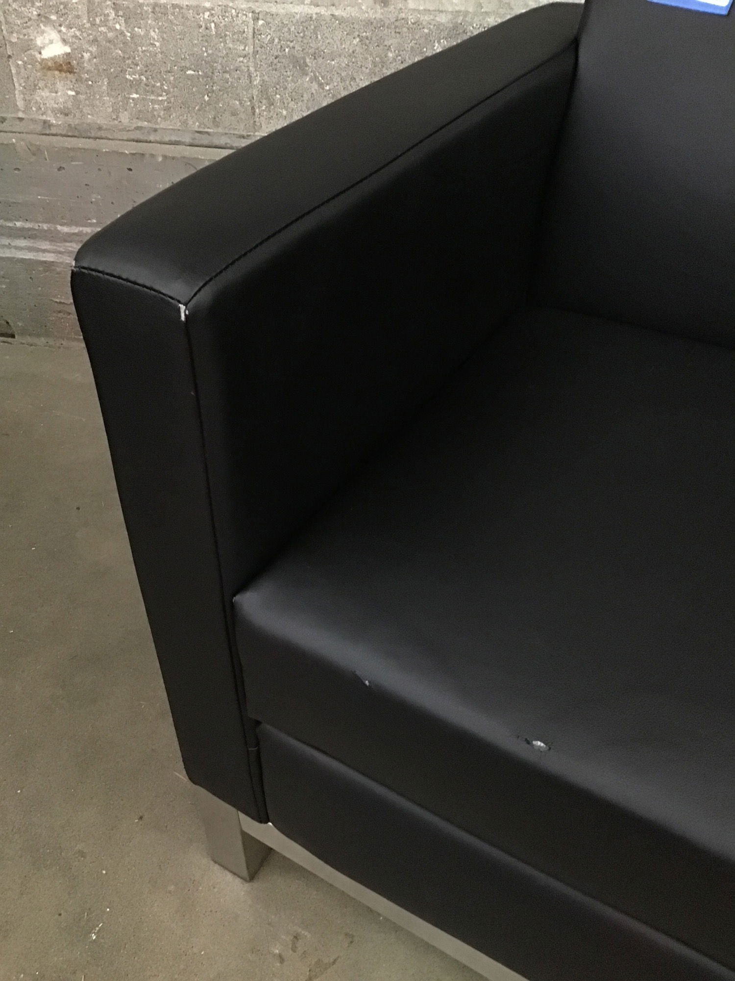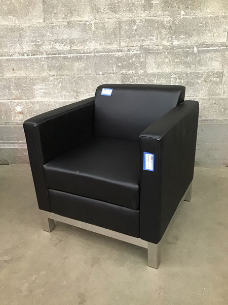 Black pleather easy chair that has some wear to original upholstery. Price reflects. Has brushed steel legs.