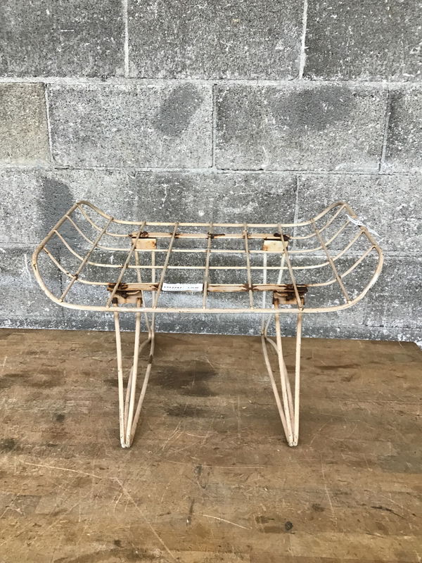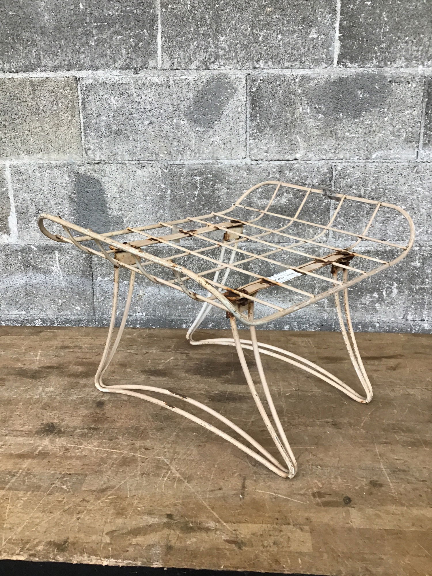 Steel rod constructed patio foot stool of the midcentury persuasion. It needs a cushion--and maybe a fresh paint job.
