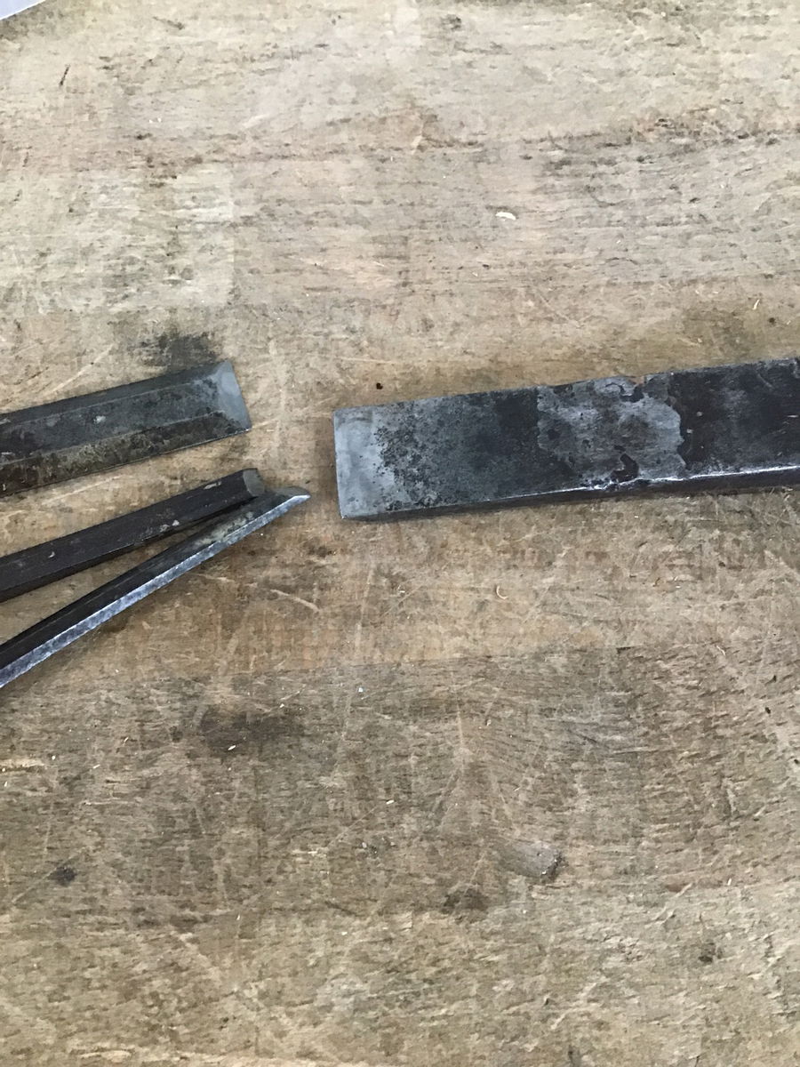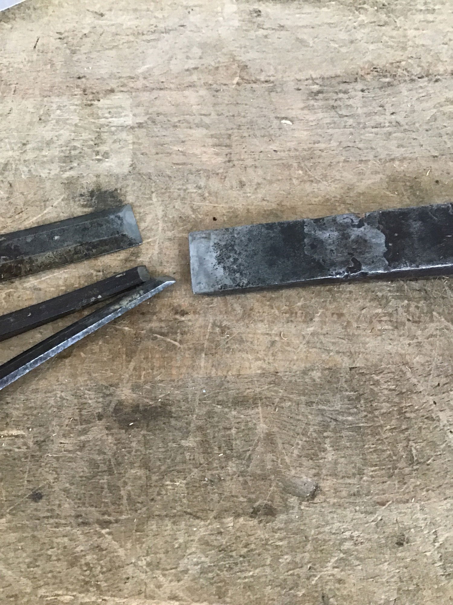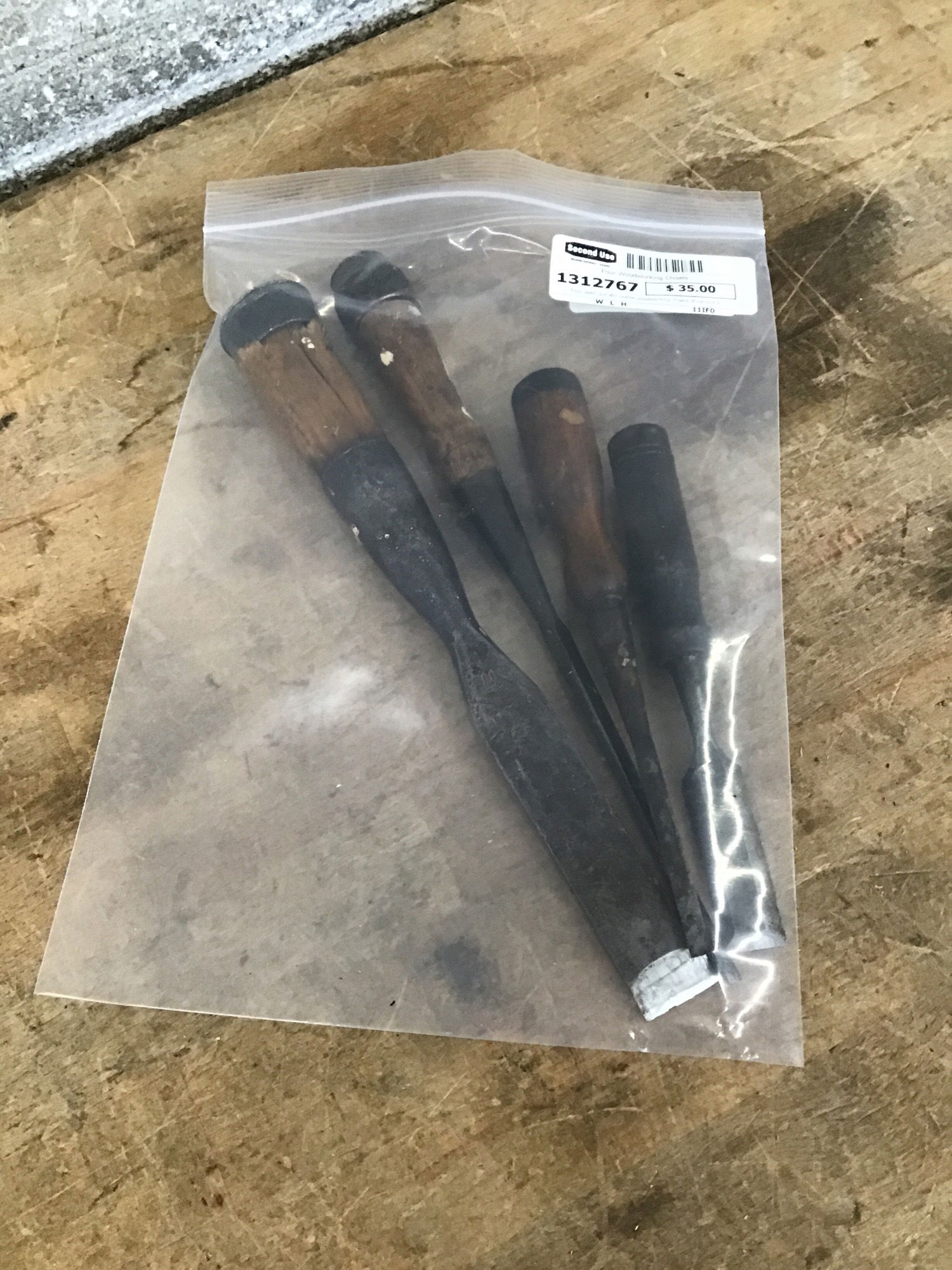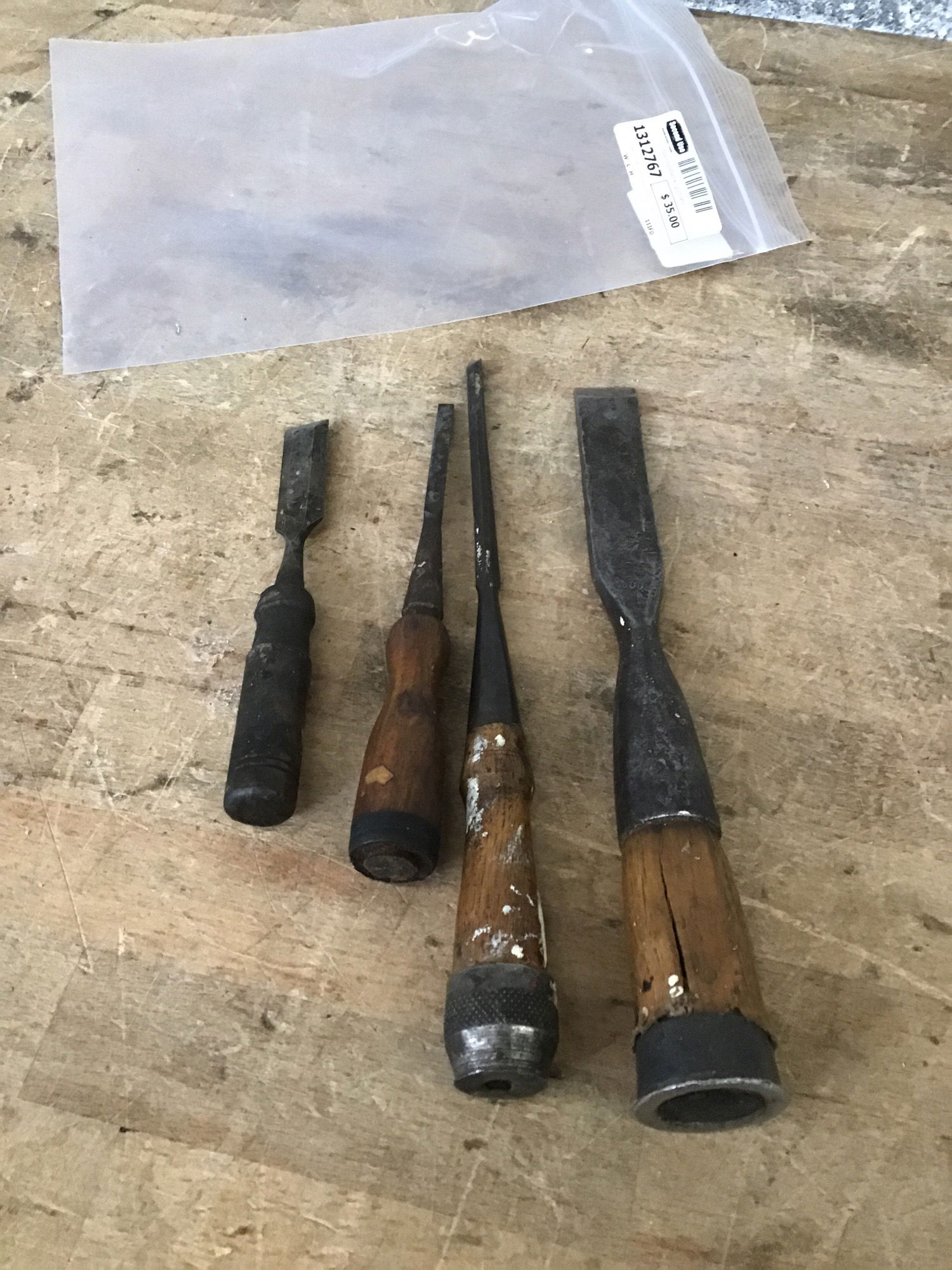 Four used, but still usable woodworking chisels of various sizes. The widest one has had a repair done to it, which, while damage, is kind of cool.