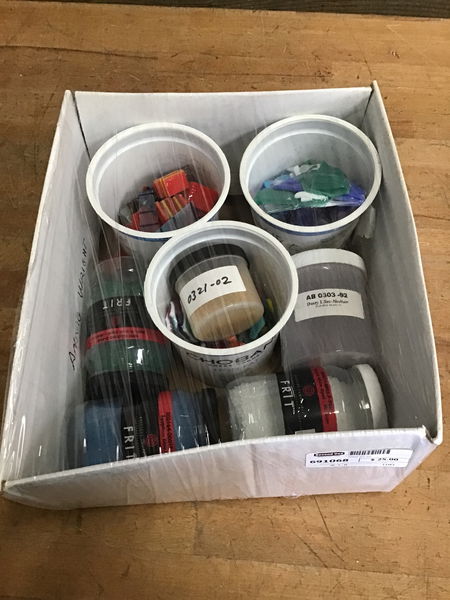 Bottles with a useable amount of glass frit in jade, lilac, opaque white and Egyptian blue colors and fused glass pieces with a bunch of different colors.