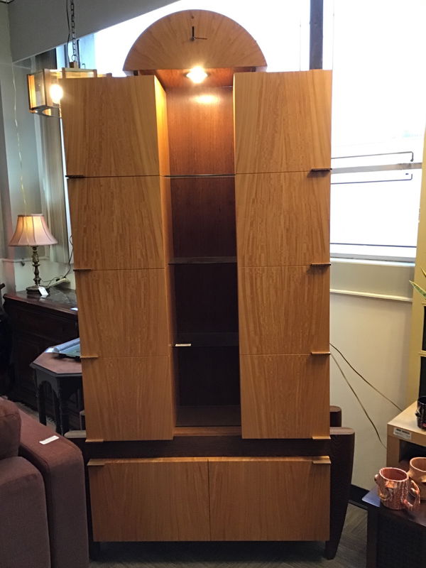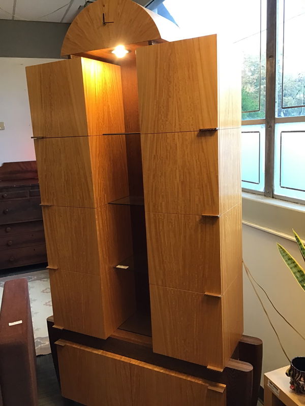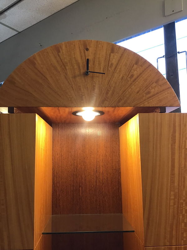 WOW! I can't take my eyes off this one-of-a-kind custom cabinet made of curly figured maple (that has been bookmatched to create a mesmerizing pattern) and wenge (a very dense and richly colored tropical wood), held together with seamless mortise and tenon joinery. Features ten cabinets, four tempered glass shelves lit by a single bulb, and a minimalist clock seamlessly integrated into the arched top. This is the piece you've been holding out for!