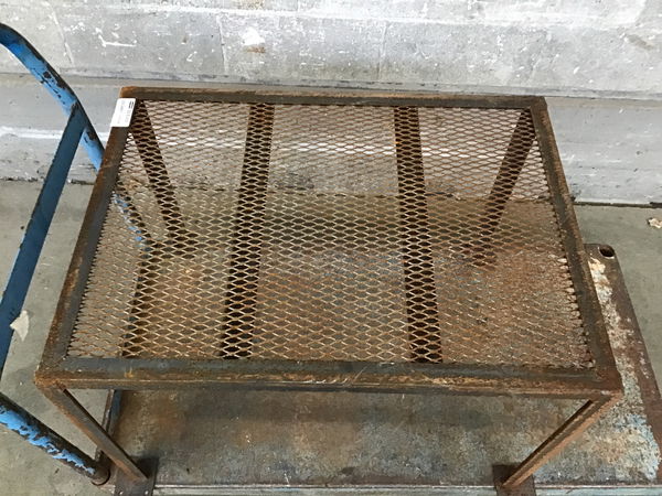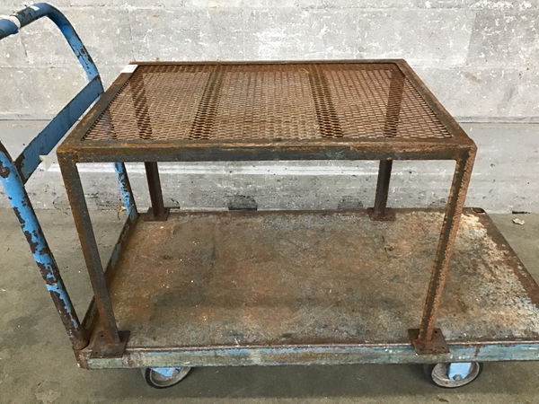 Charming, work worn, homemade industrial chic steel work table with expanded metal top This may be ready to join the ranks of 'plant stand', it's cute. The legs will need some sort of feet/pad to keep it from scratching your floors.