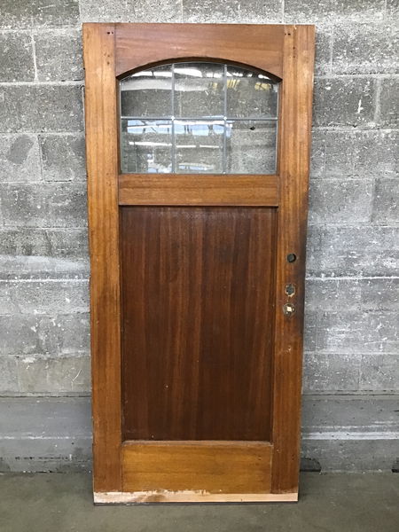 Beautiful mahogany exterior door with lots of potential, and a price that reflects a few unfortunate features - two cracked glass panes and a J-strip.