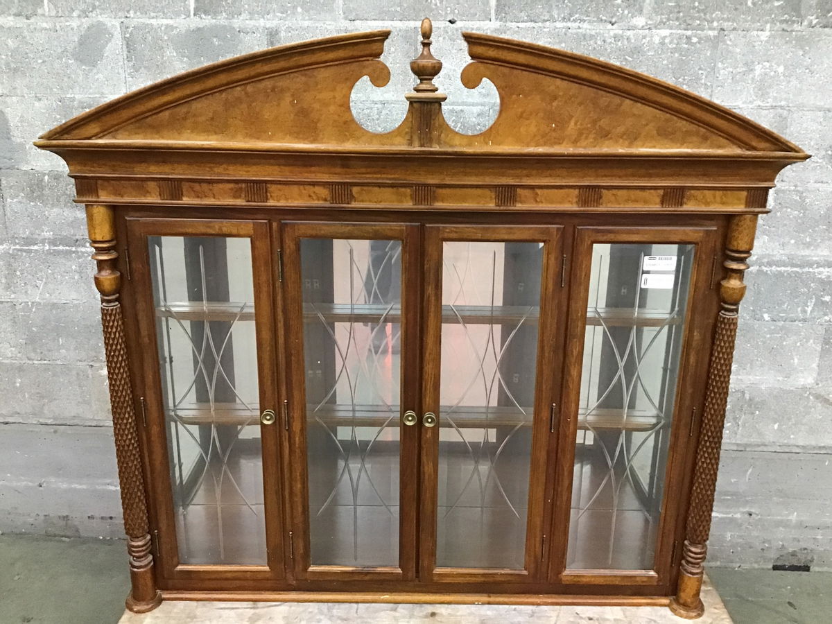 This is a fine looking hutch top. This will need something to stand on or if you are feeling adventurous, you could attempt to mount it and have it be a floater. Has four glass doors, mirror backing, and two built-in lights. The top trim does come off.