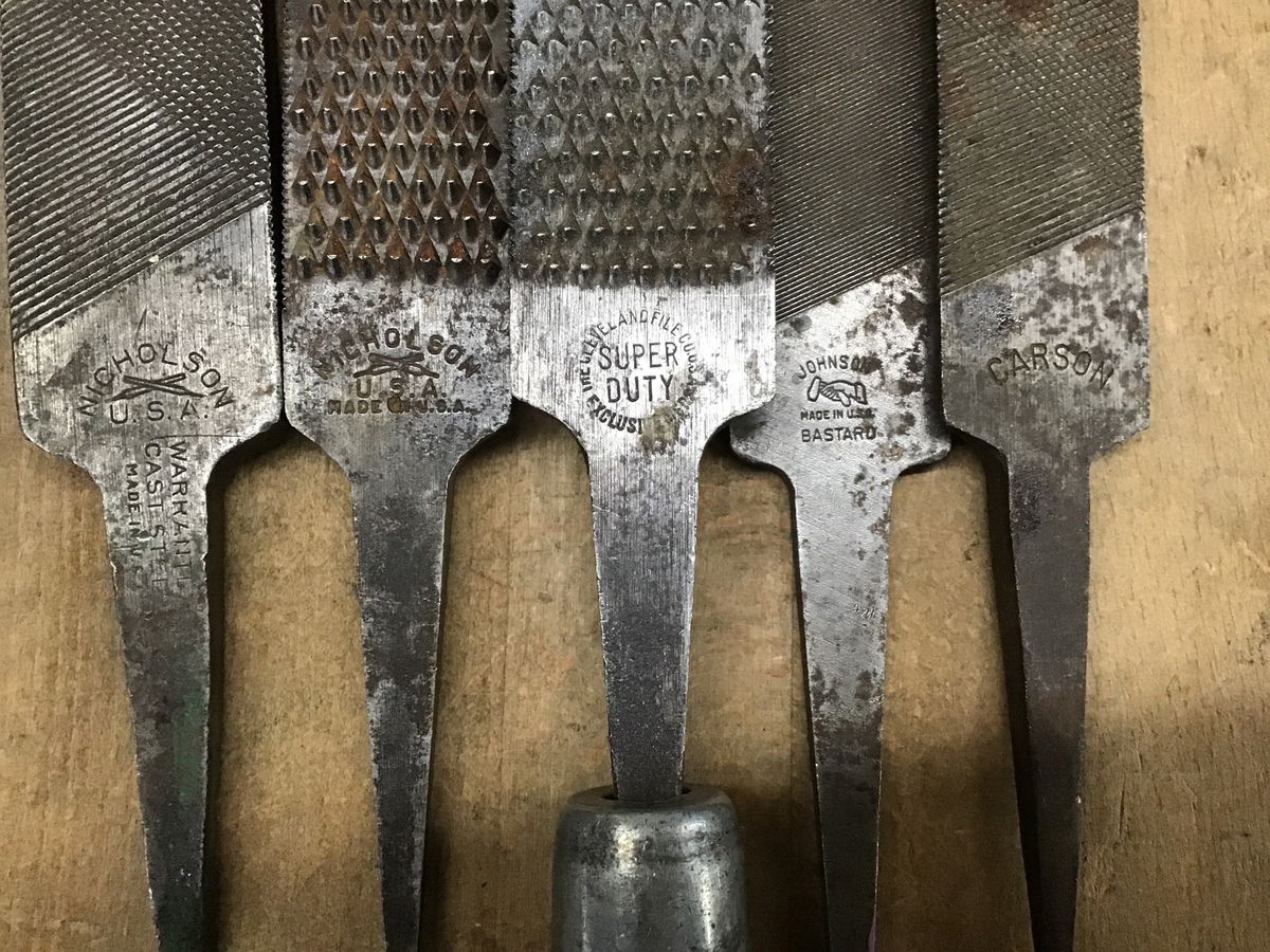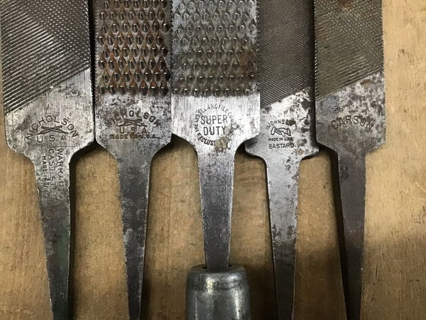 Great collection of 8 various large format wood and metal files. Included names: 2x Nicholson, Carson, and R. Huff and CO. Several have handmade handles for extra holdability. The largest wood rasp has a 16" surface!