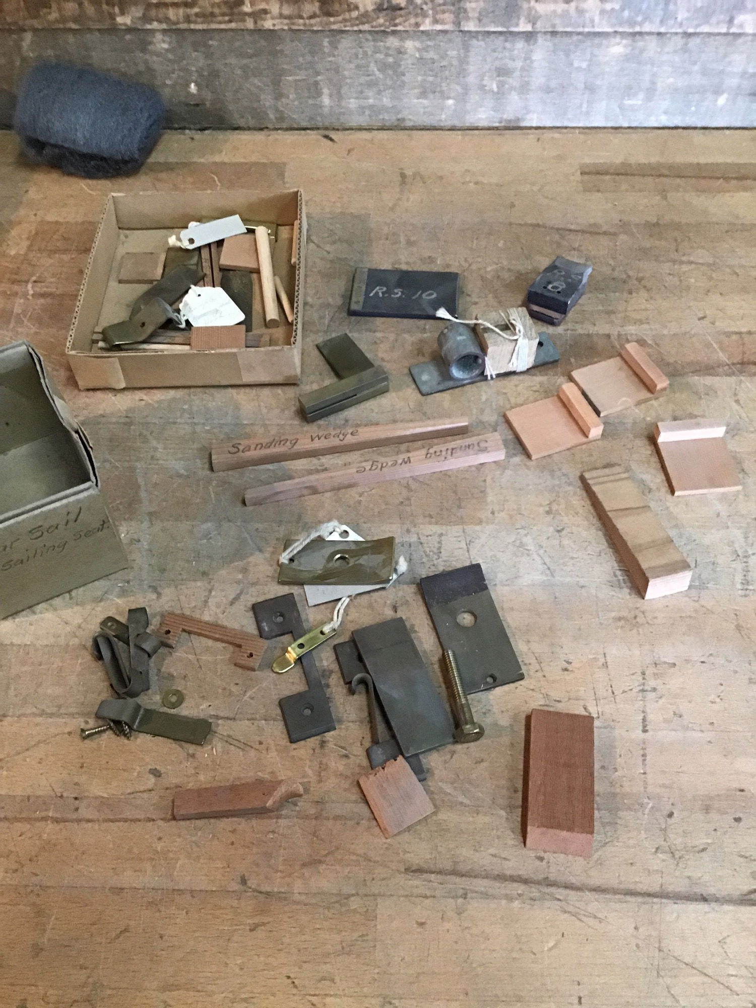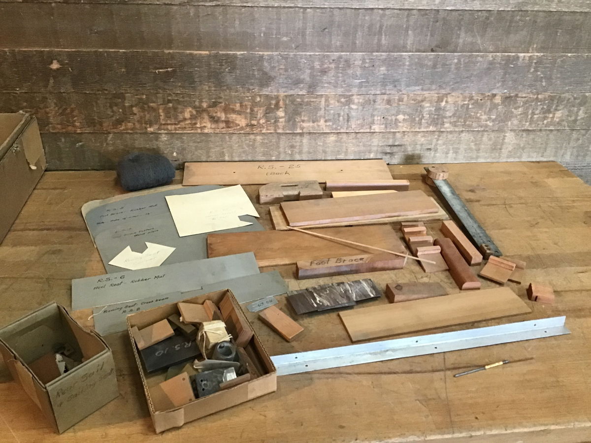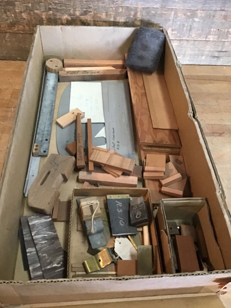 Vintage box of rowing and sailing seat jigs, from the Willits Brothers original shop. A great mix of hard and soft wood smalls (great for projects outside of boats!)