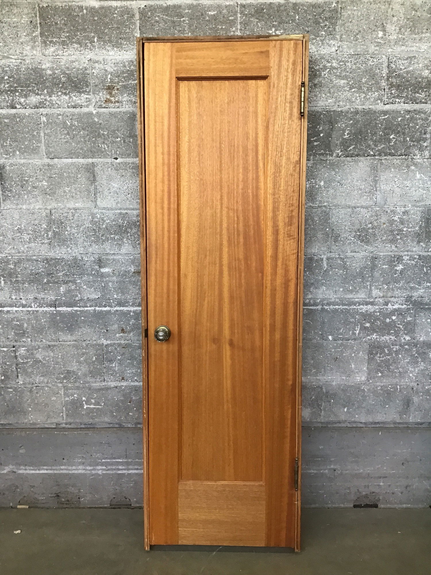Beautiful! This prehung single panel solid core door has particularly thick oiled Mahogany veneer over fir construction. It has brass plated steel ball finial hinges and a Mahogany jamb, so you know this is a quality piece. Our wood expert believes that this door is made from either Honduran or Cuban mahogany, which are import controlled and commercially extinct in the United States.