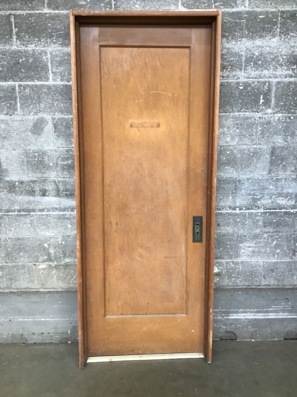 A prehung door with rich CVG fir construction that's visible on one side, while the other has been painted white. Still has a pair of vintage escutcheons installed.