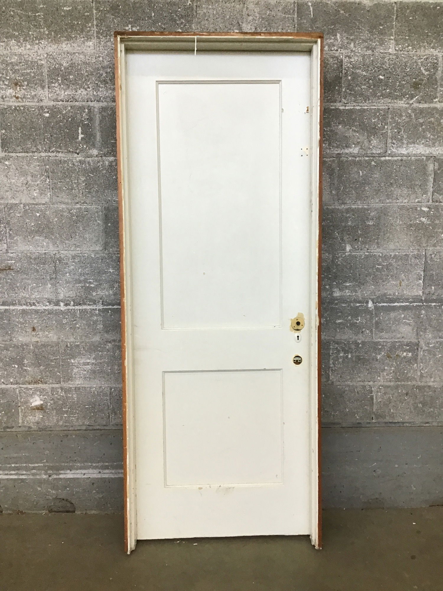Vintage in-jamb two-panel door painted on one side with a dark stain on the other.