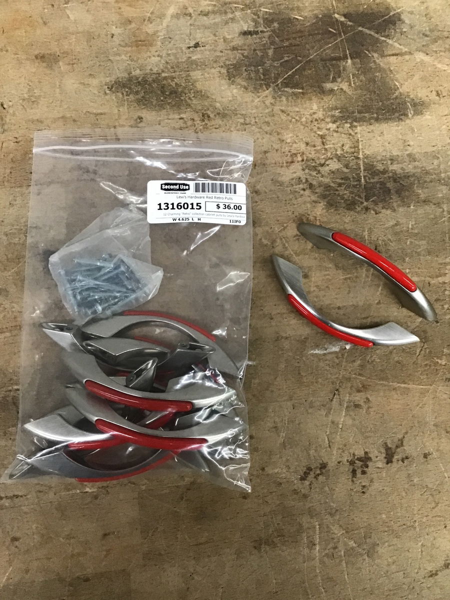 12 Charming "Retro" collection cabinet pulls by Lew's Hardware in tasty Candy Red! 3" center to center holes. The brushed nickel finish is in good shape and the enamel finish is nice and glossy with some fleabites on a few. These pulls sell new for about $8 each.