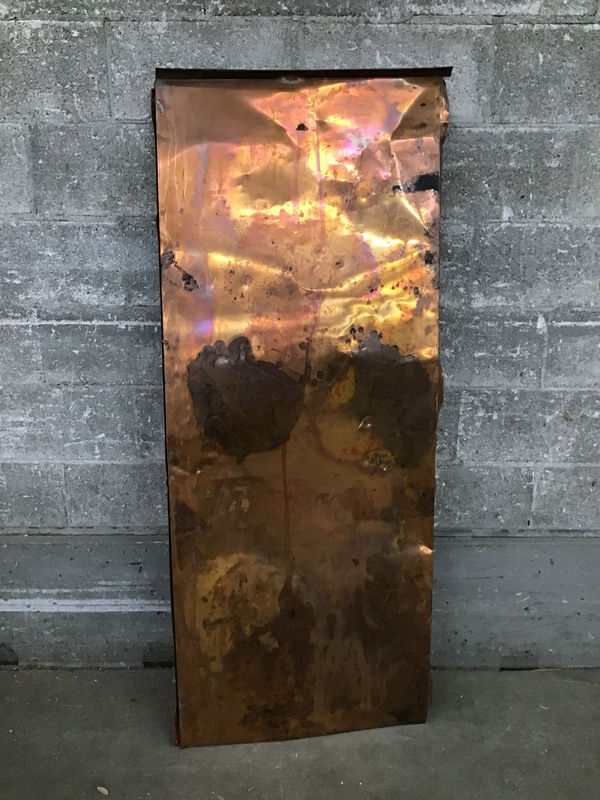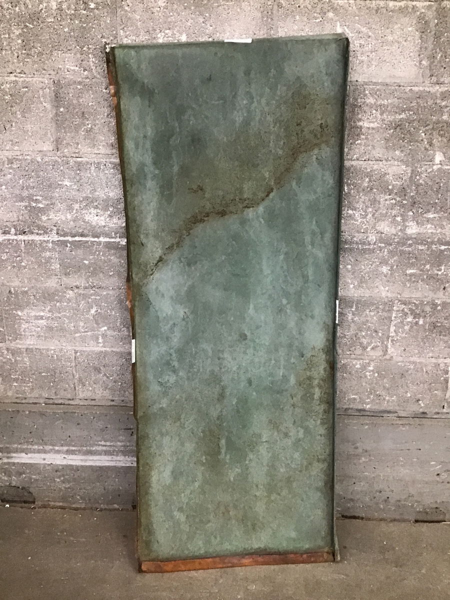 Nicely aged copper roofing panel that is crimped on both edges. If the crimped edges were flattened you'd have a ~26" wide sheet. One side is weathered. The "bottom" looks more like traditional copper. It may have a little dust/dirt or tar residue from being on a roof for forty plus years. Could make a great interior accent wall, use as wainscoting, or metal working projects--if you're not ready to put on a copper roof. Dimensions are approximate. Weighs ~1 pound per square foot. Photo may be representational.