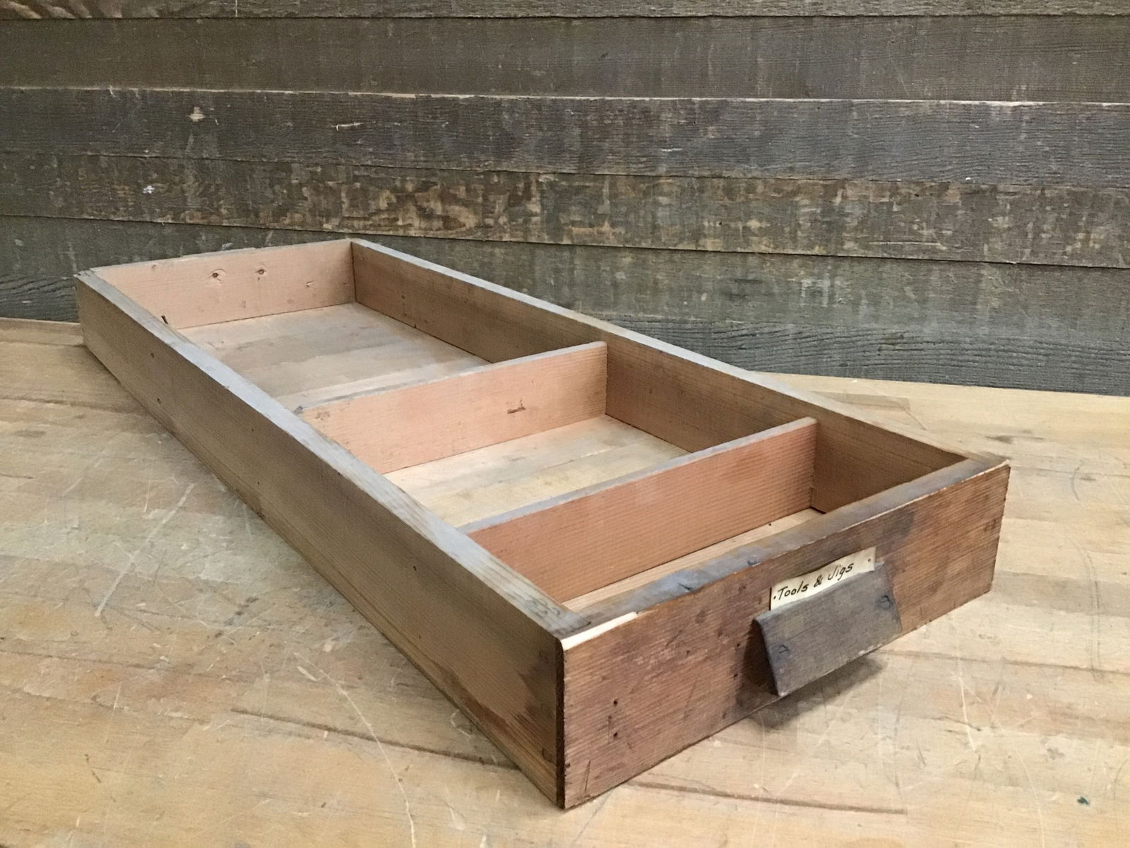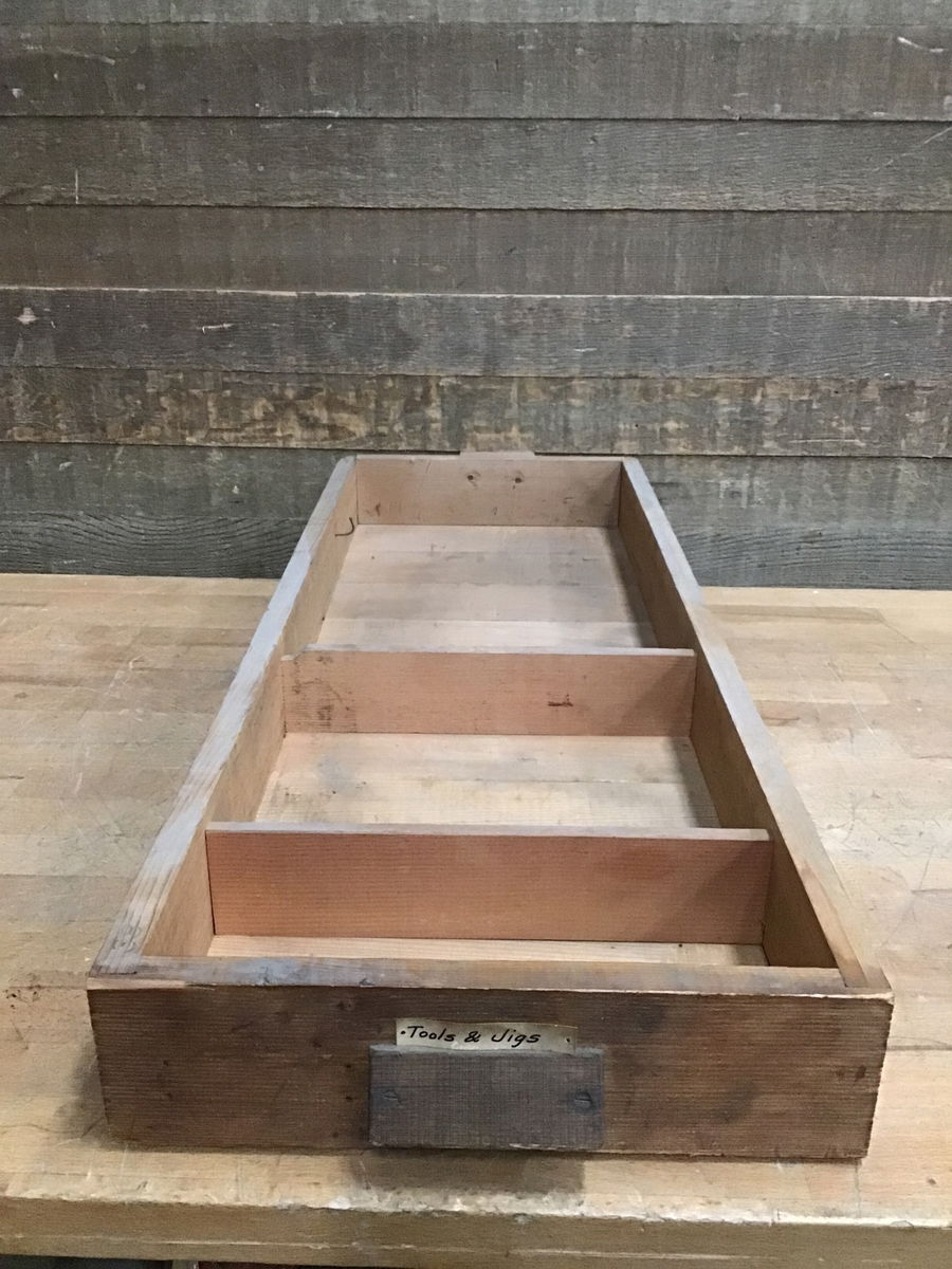 Vintage Fir wood drawer with divided sections and cute wood handles, from the Willits Brothers original shop. A great piece of local history to help keep your work space organized!