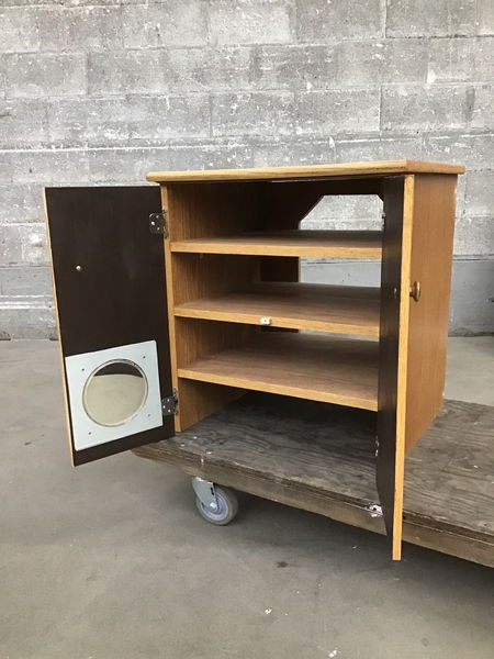 A petite sized cabinet with two doors and 3 interior levels of shelving. This would need some kind of toe kick installed for ease of access, but otherwise is a very solid cabinet.